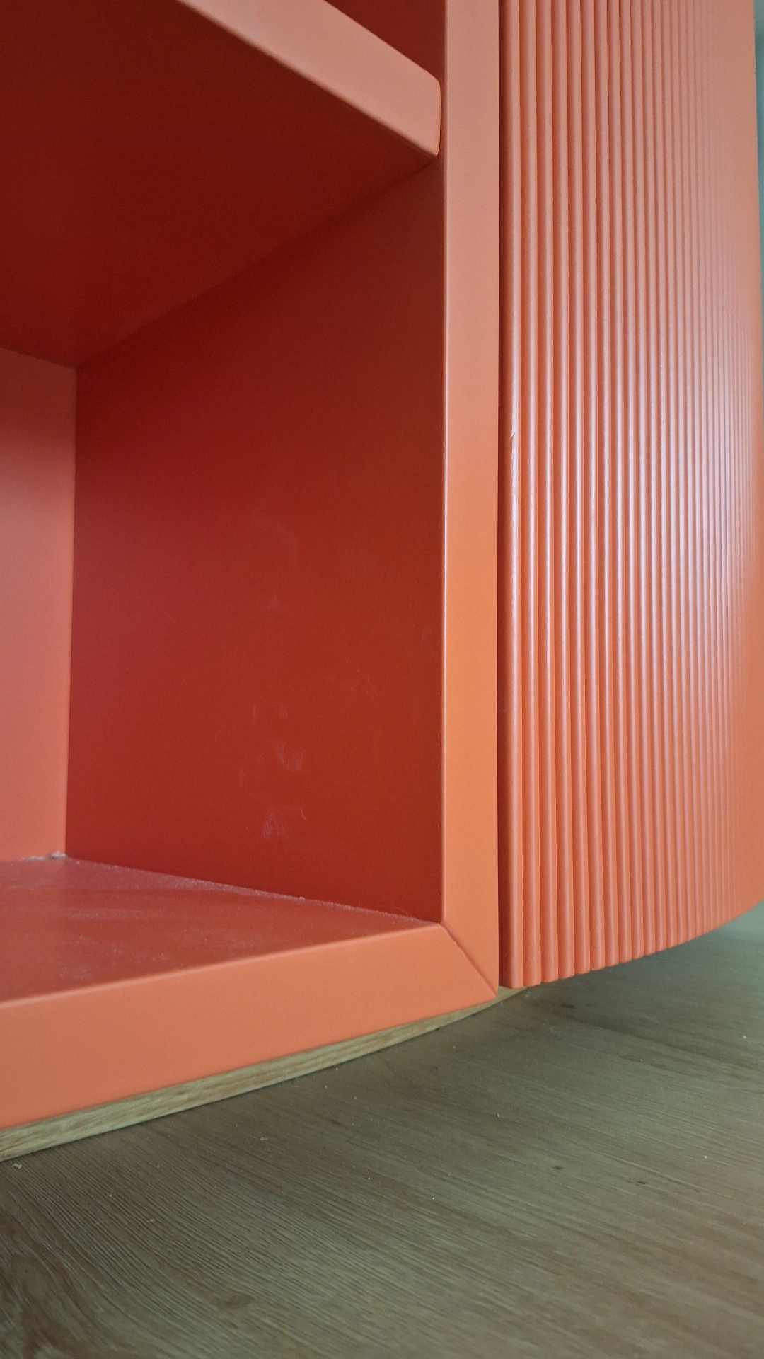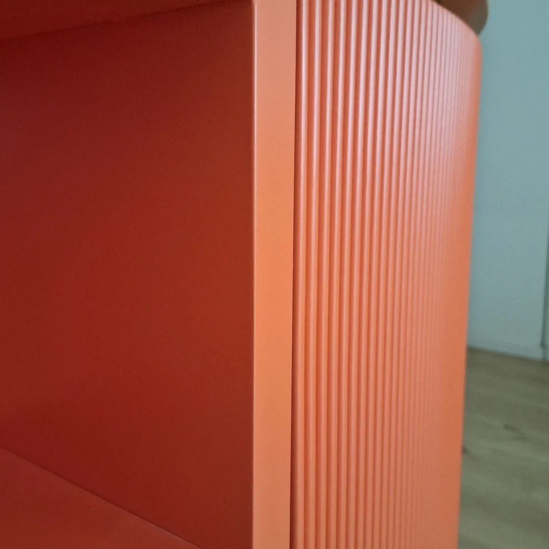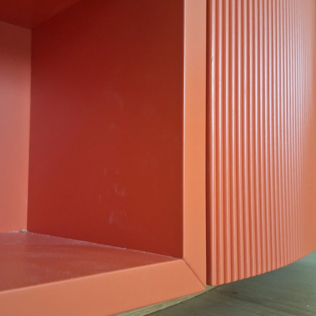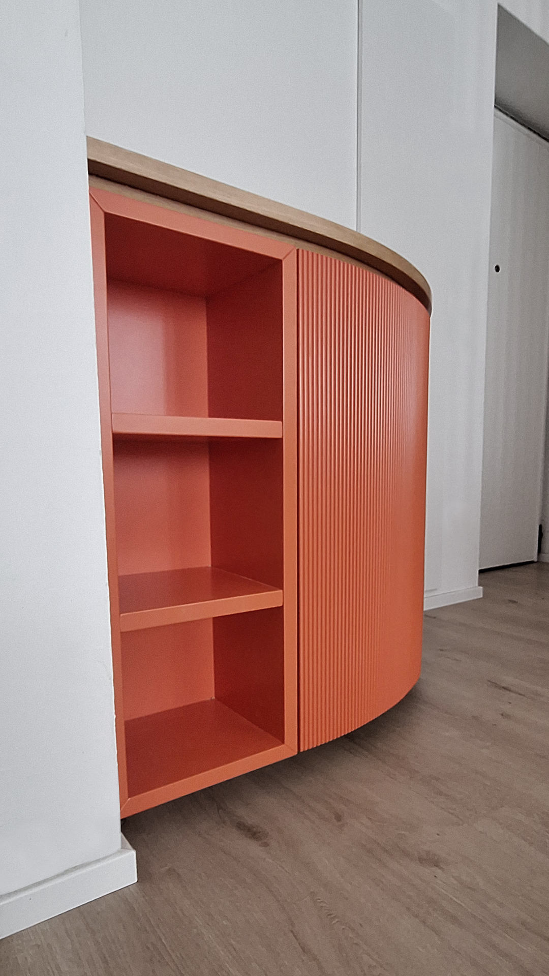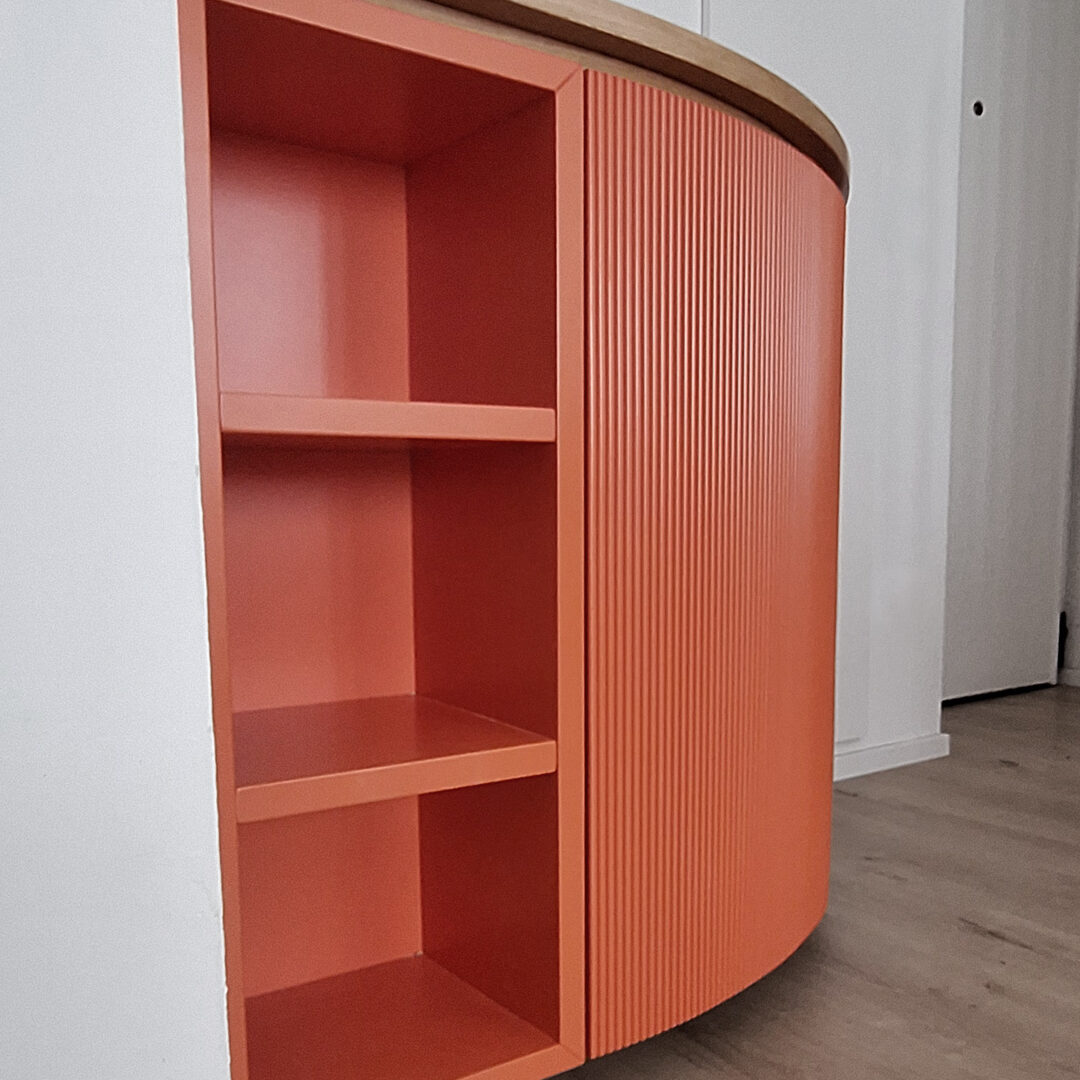 Questo mobile di ingresso è un pezzo di design elegante e audace, progettato per abbracciare una parete ad angolo di 90°. La sua forma curva e sinuosa crea un effetto avvolgente, reso ancora più interessante dagli sportelli cannettati laccati in un rosso intenso, che donano profondità e ritmo alla superficie. Il contrasto con il piano di appoggio e lo zoccolino in rovere naturale aggiunge calore e un tocco organico bilanciando la vivacità del rosso.