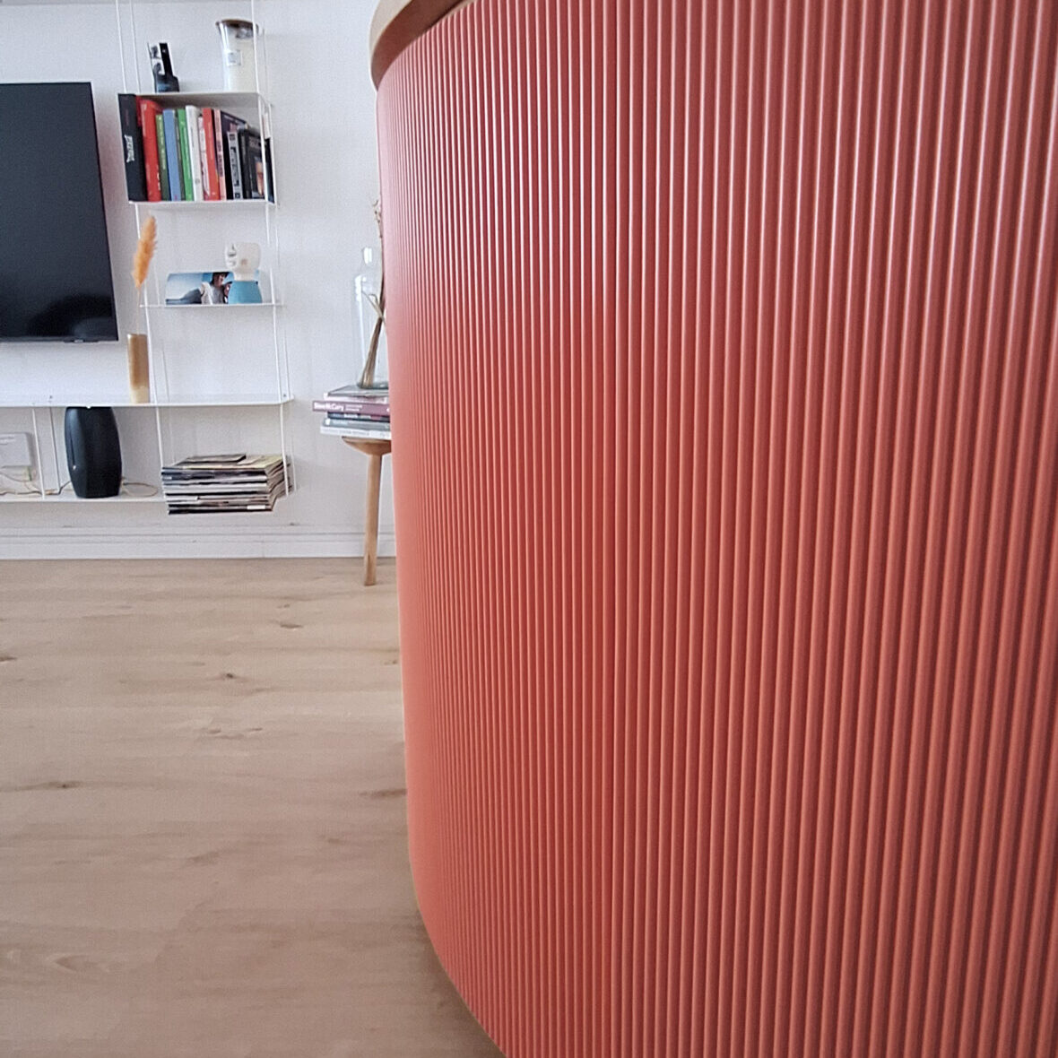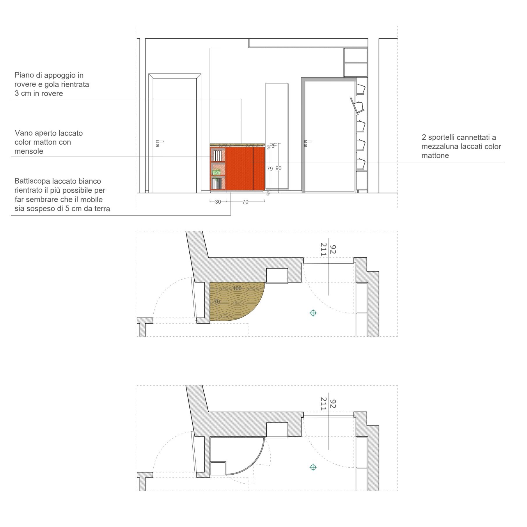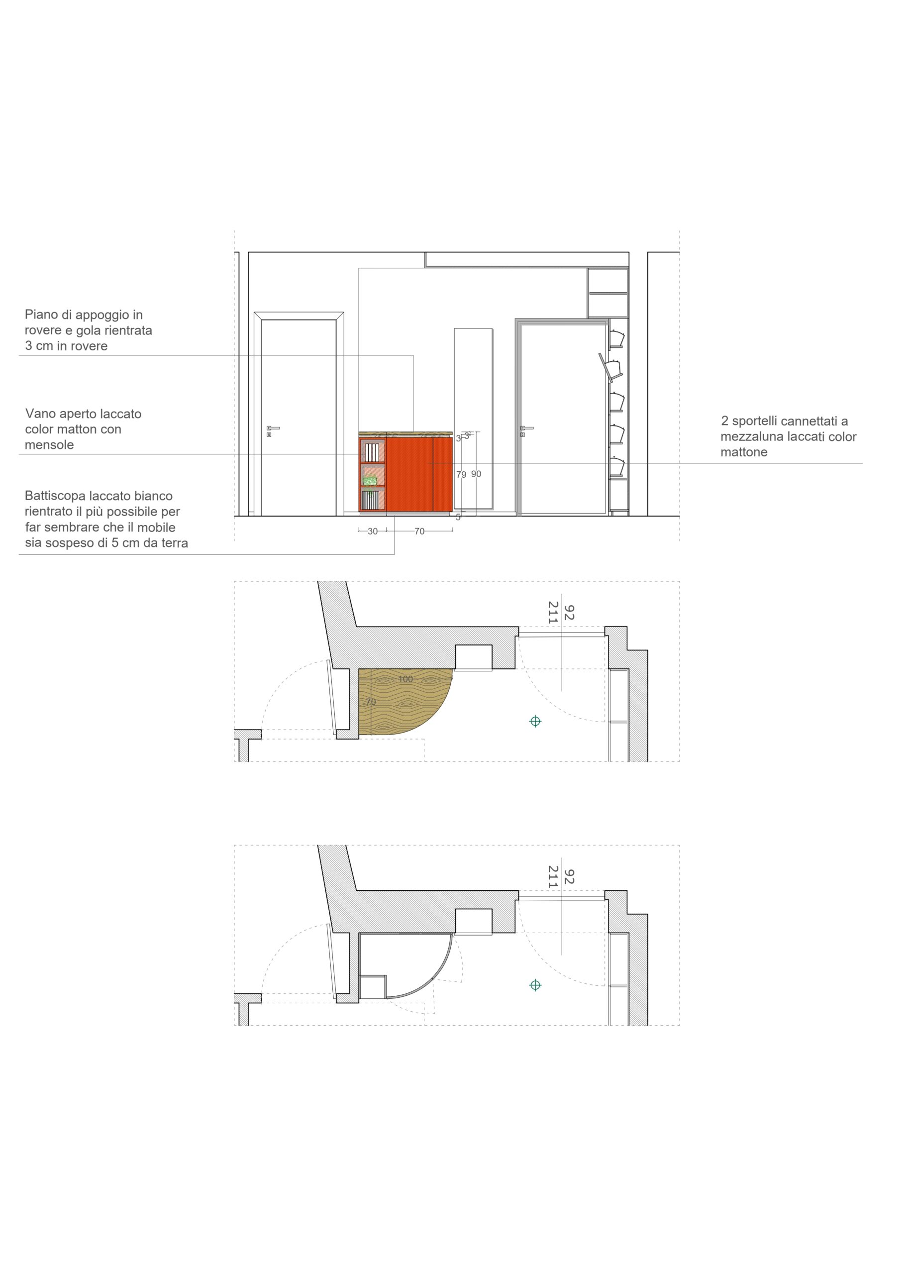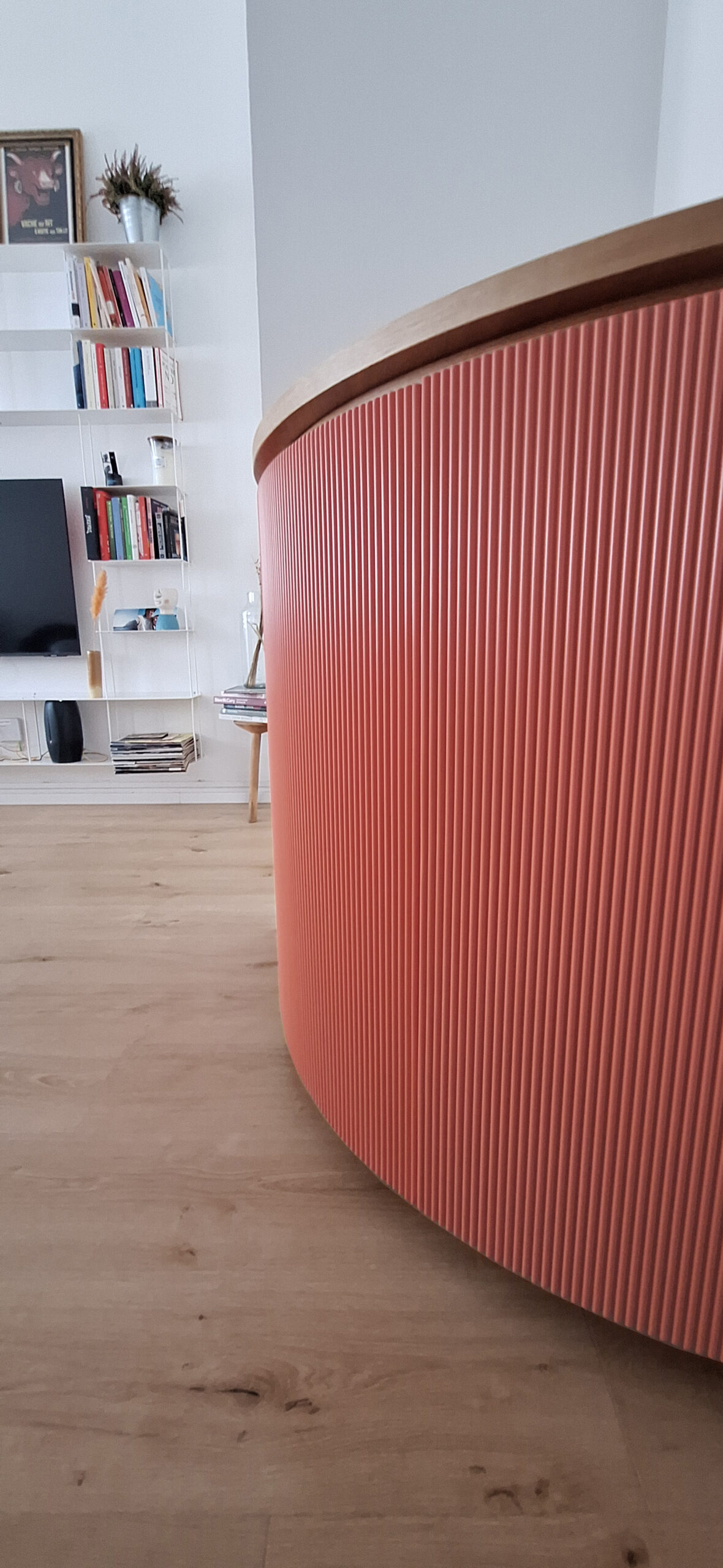 Questo mobile di ingresso è un pezzo di design elegante e audace, progettato per abbracciare una parete ad angolo di 90°. La sua forma curva e sinuosa crea un effetto avvolgente, reso ancora più interessante dagli sportelli cannettati laccati in un rosso intenso, che donano profondità e ritmo alla superficie. Il contrasto con il piano di appoggio e lo zoccolino in rovere naturale aggiunge calore e un tocco organico bilanciando la vivacità del rosso.