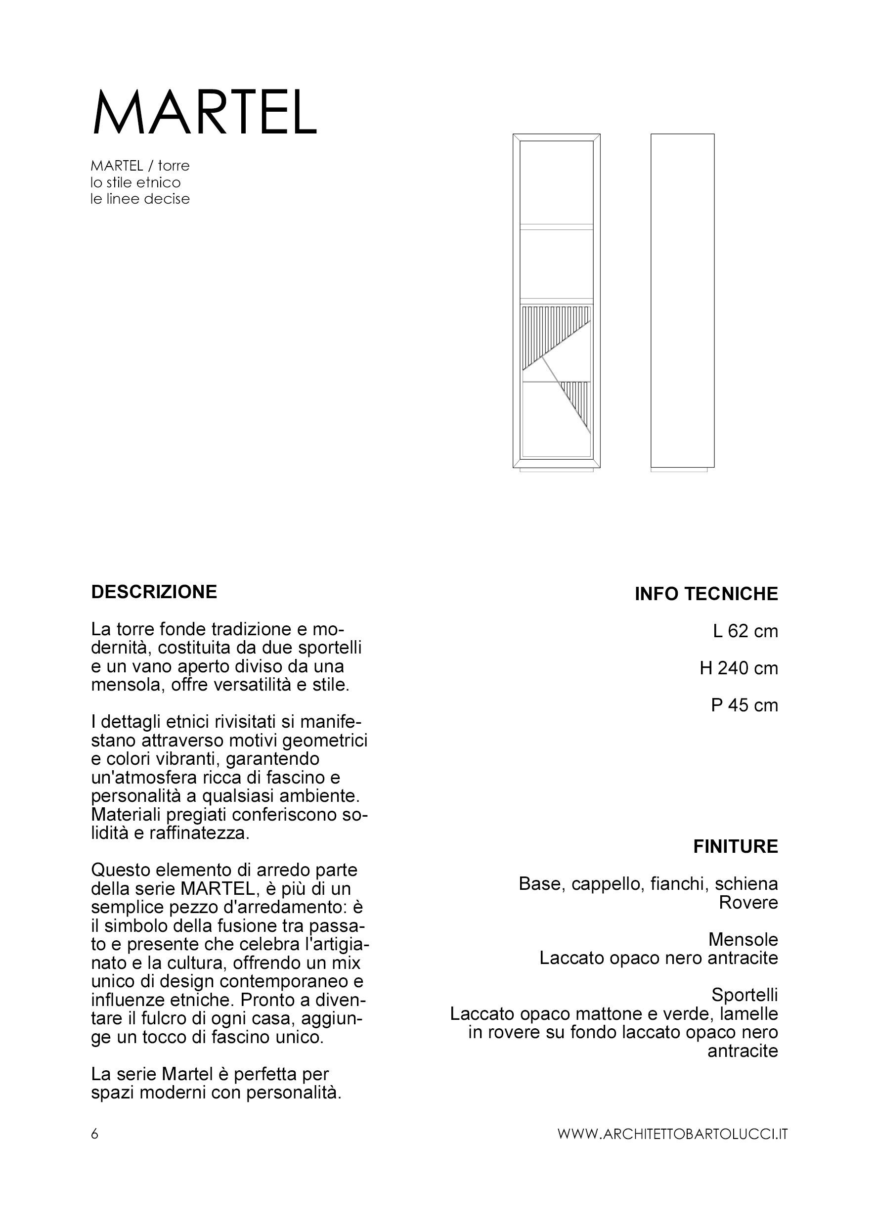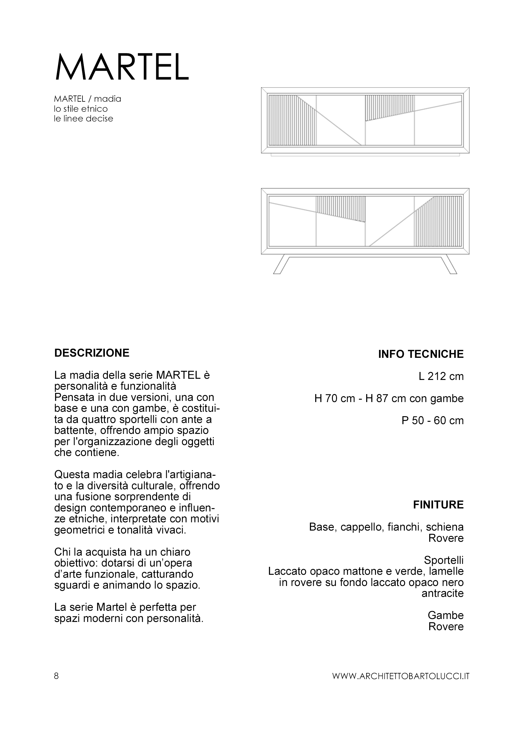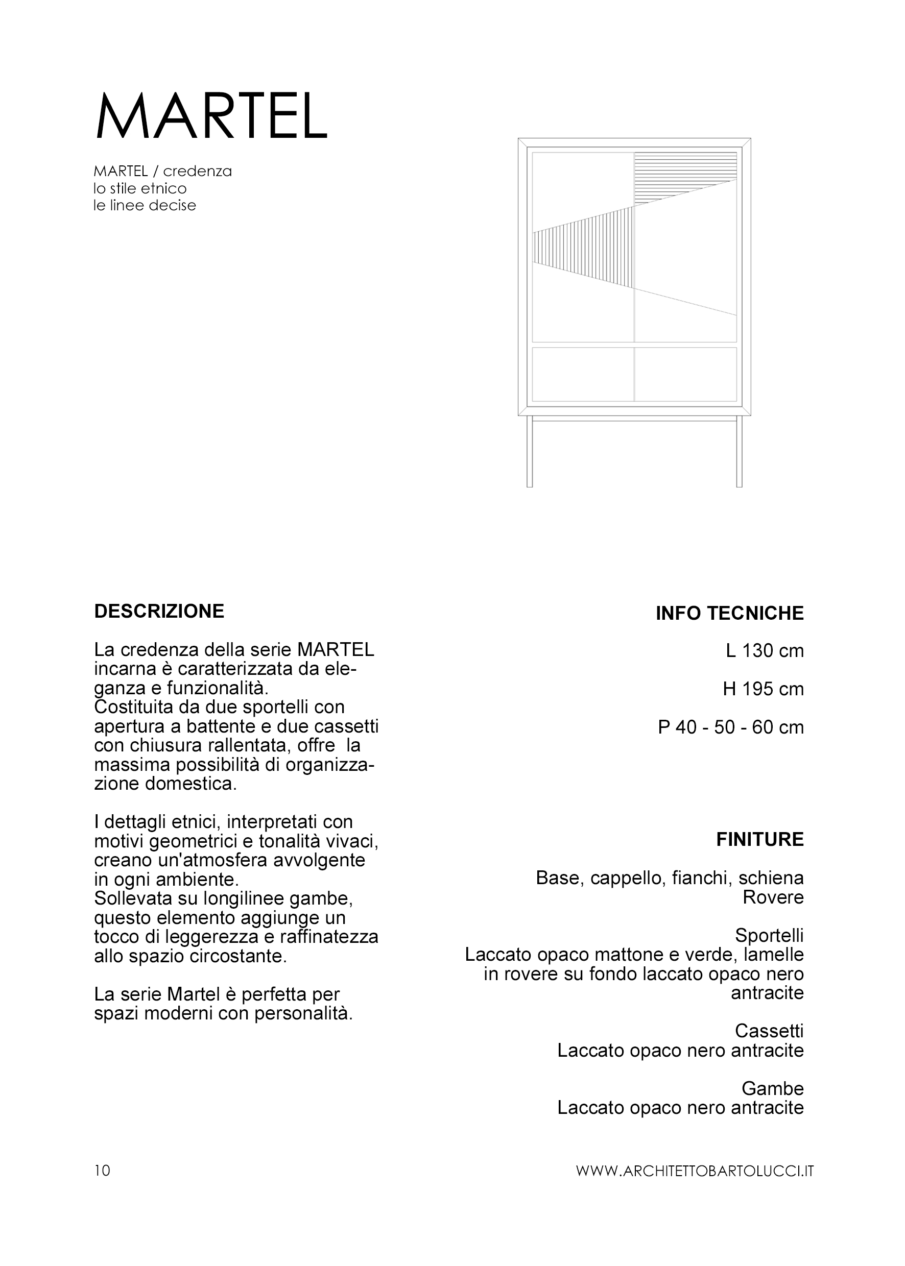 Ogni mobile è personalizzabile: la collezione include dieci pezzi di design pensati per avere misure precise, ma è possibile richiederne adattamenti e personalizzazioni. L’Architetto Bartolucci lavora a stretto contatto con i clienti per comprendere appieno le loro necessità e desideri; il dialogo costante permette di tradurre le idee in soluzioni di design concrete e pratiche.