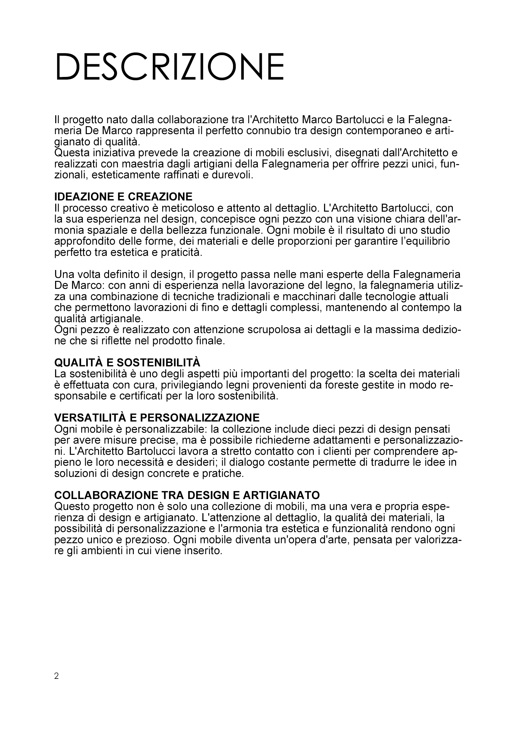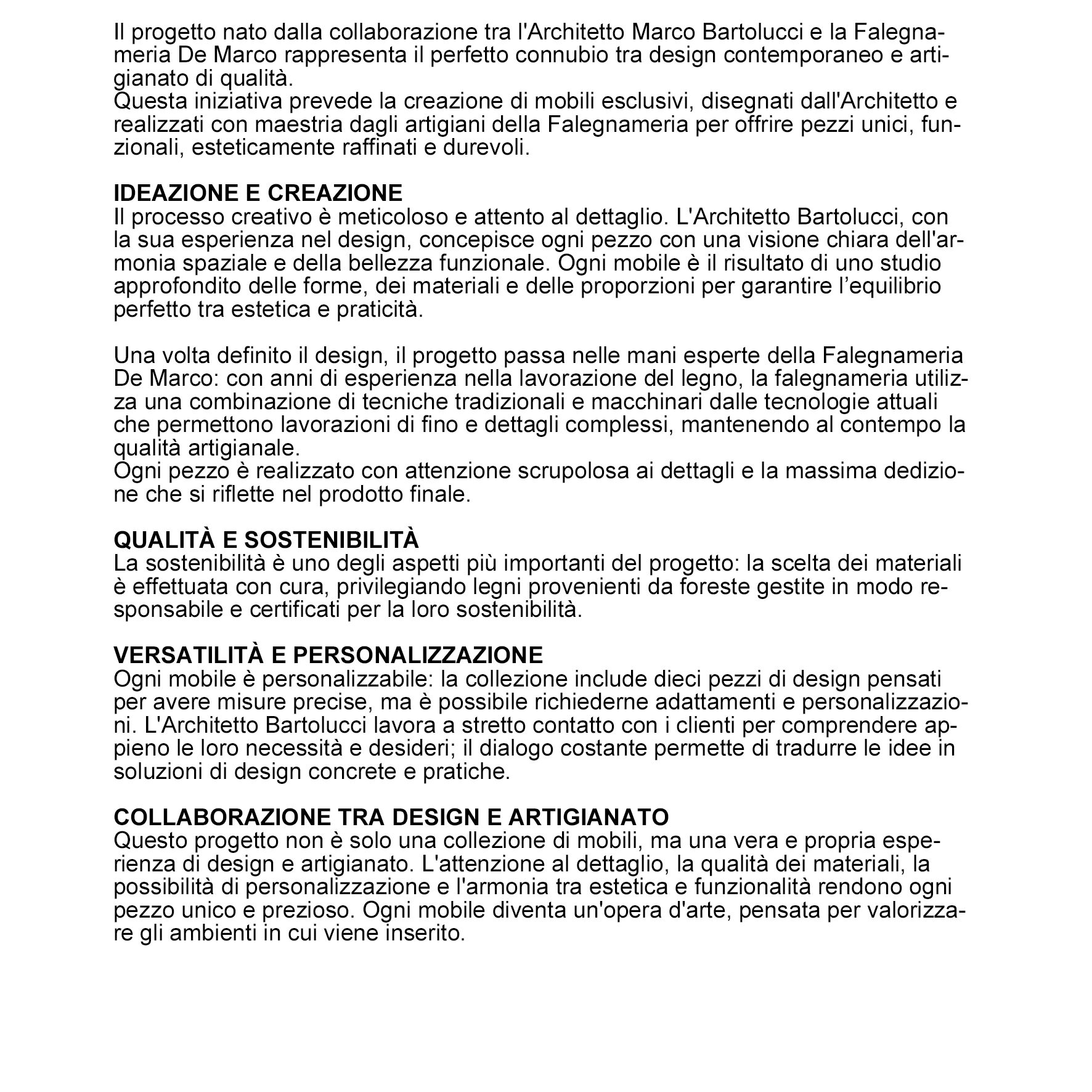 Questo progetto non è solo una collezione di mobili, ma una vera e propria esperienza di design e artigianato. L’attenzione al dettaglio, la qualità dei materiali, la possibilità di personalizzazione e l’armonia tra estetica e funzionalità rendono ogni pezzo unico e prezioso. Ogni mobile diventa un’opera d’arte, pensata per valorizzare gli ambienti in cui viene inserito.