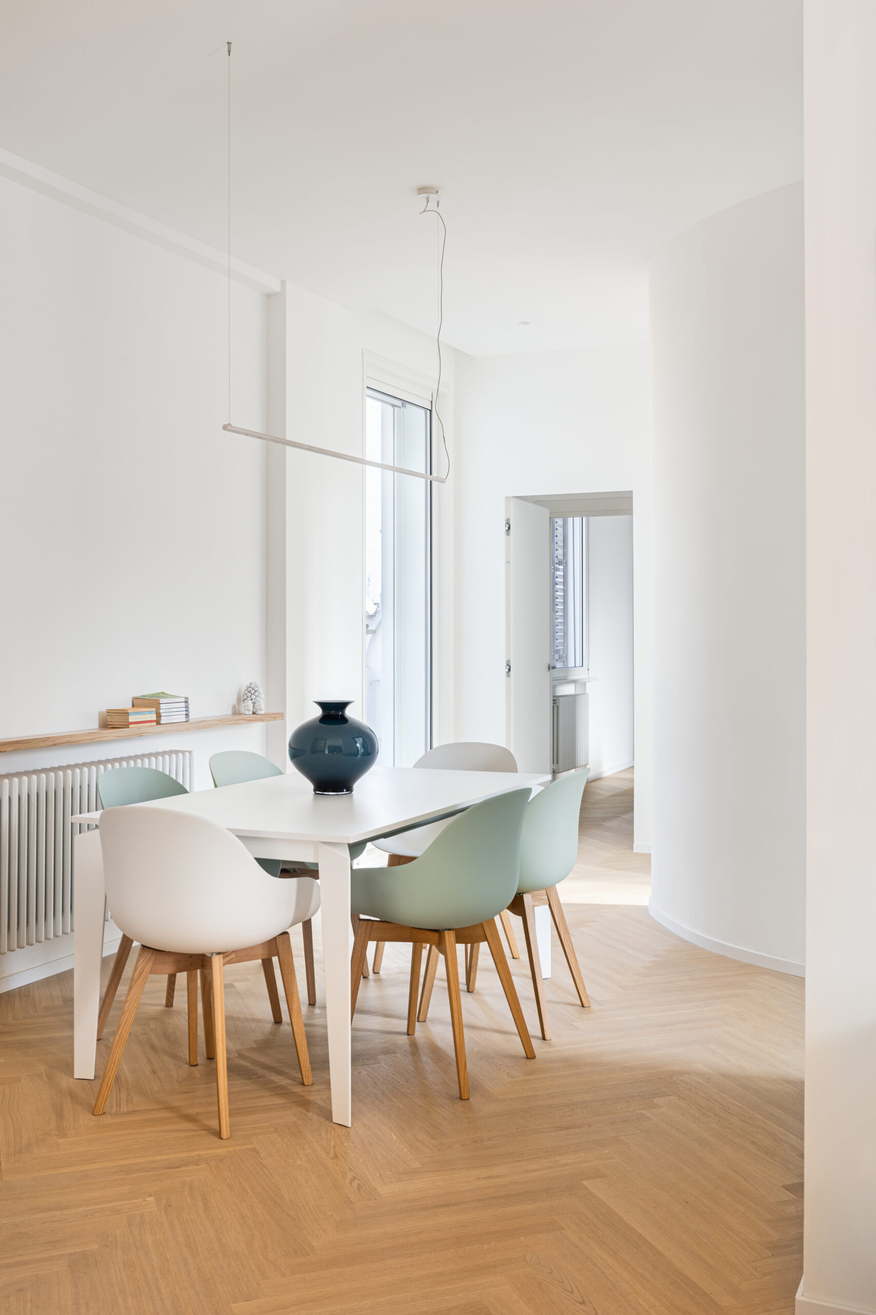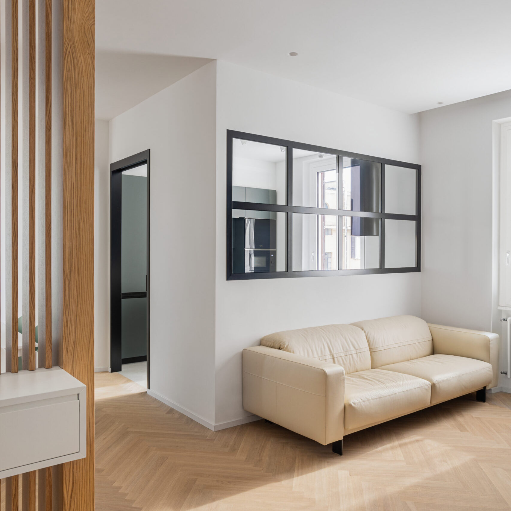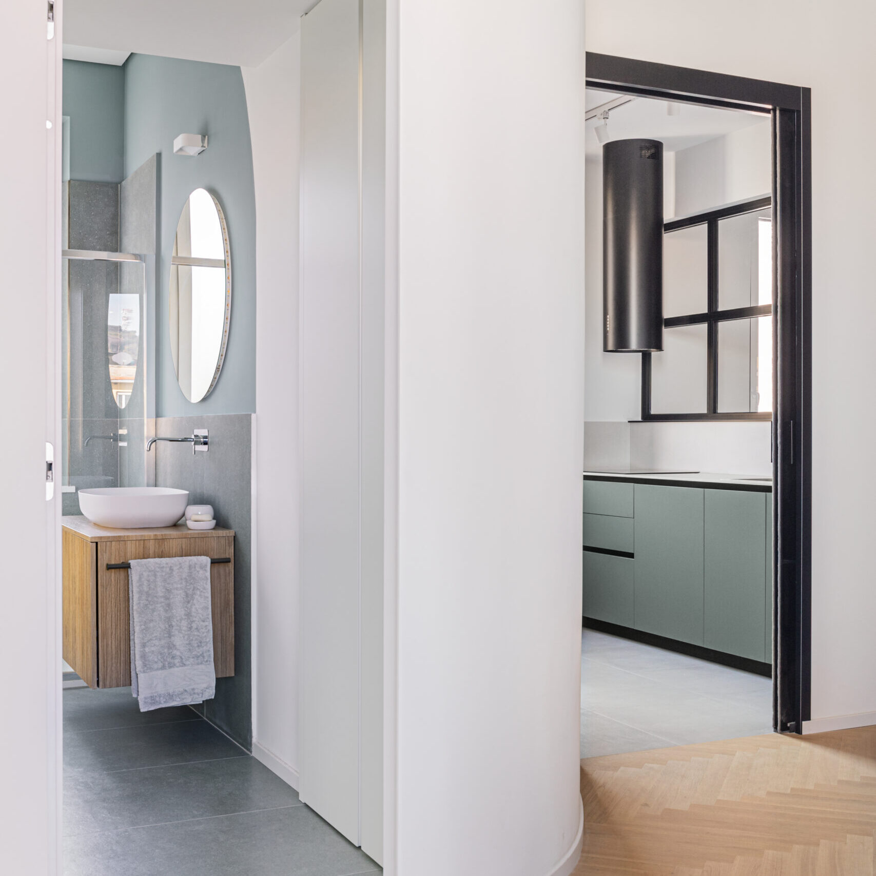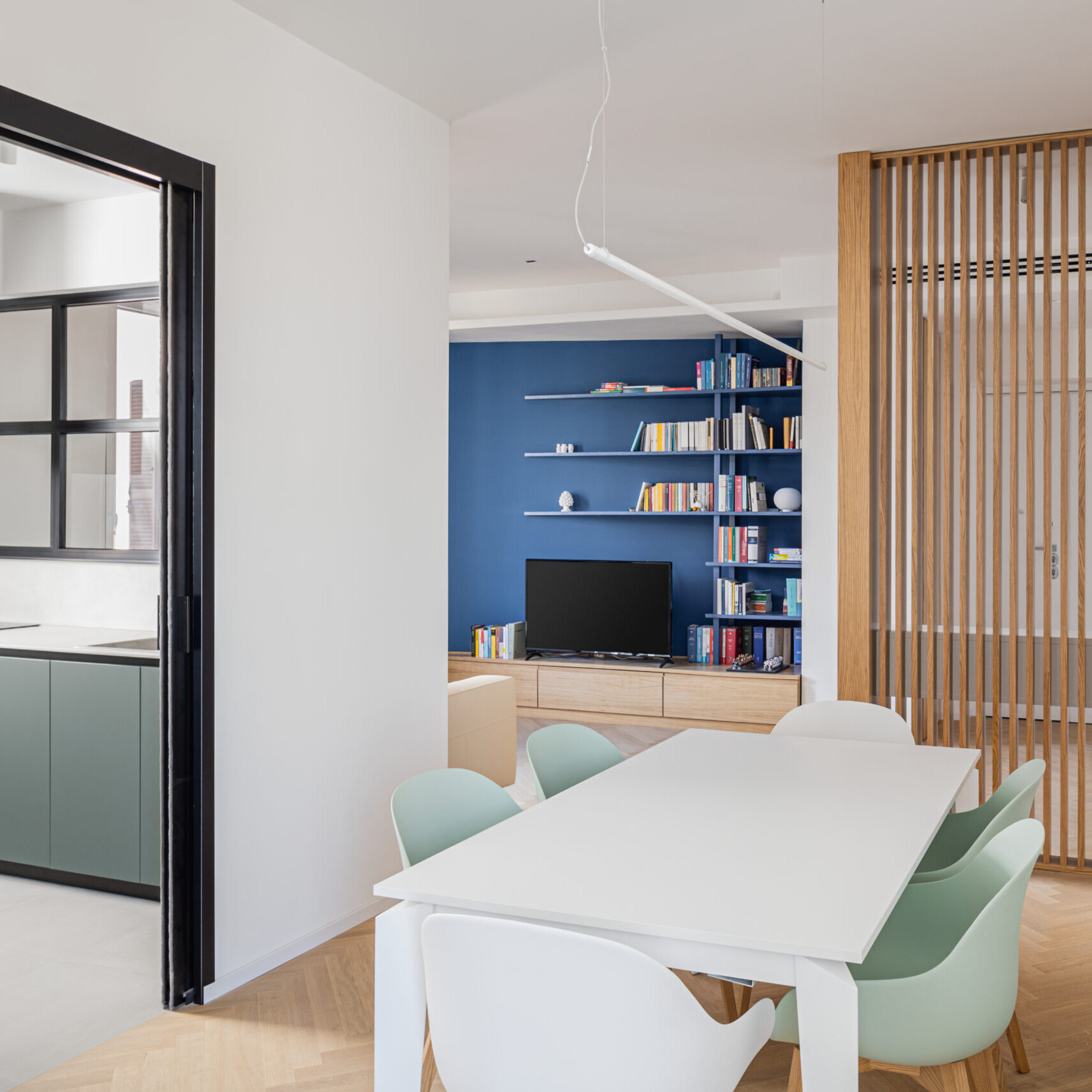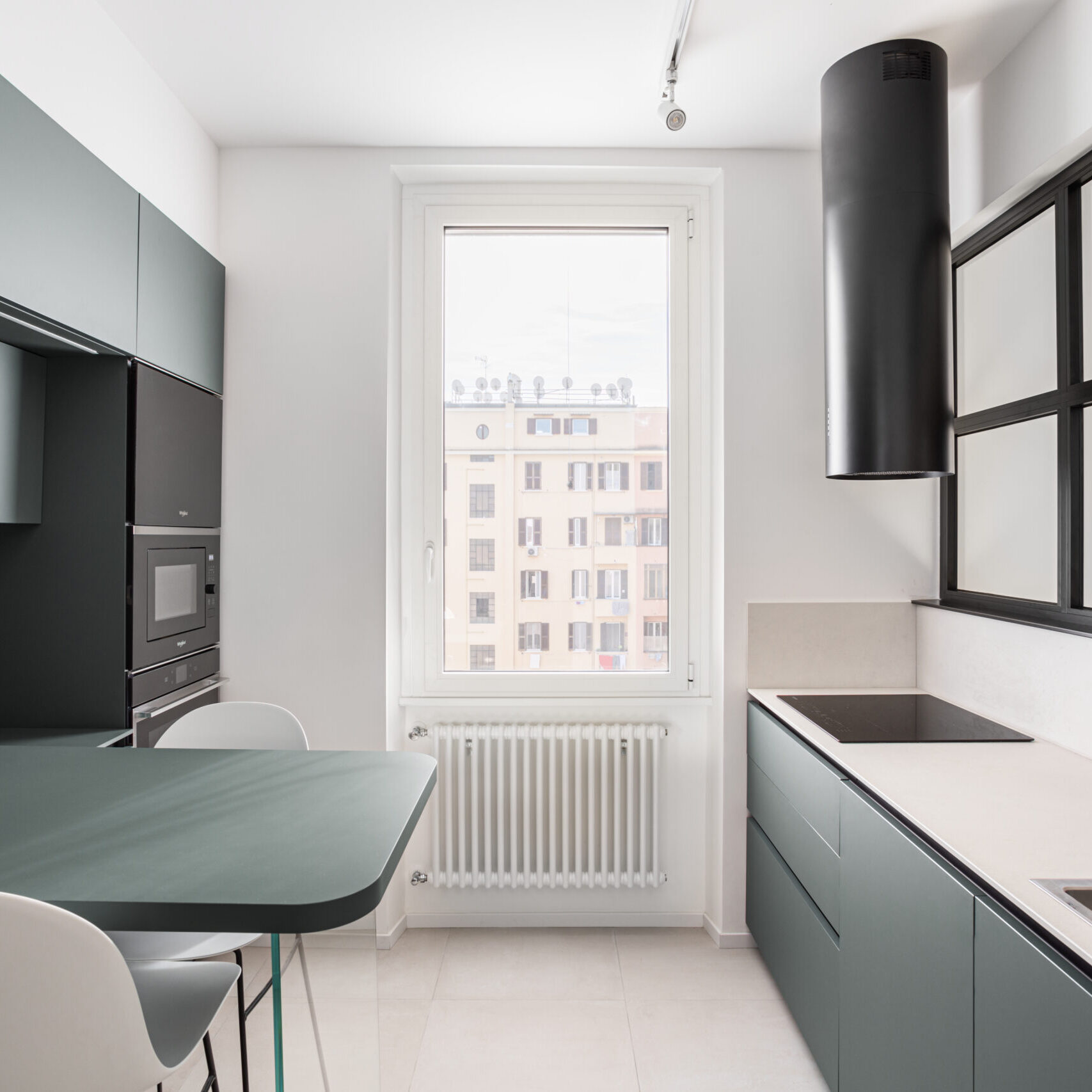 In questo appartamento in Prati a Roma abbiamo realizzato un progetto interamente su misura. L’appartamento si sviluppa in lunghezza e una delle prerogative era rendere parte integrante della zona giorno il terrazzo, elemento molto raro nel quartiere.