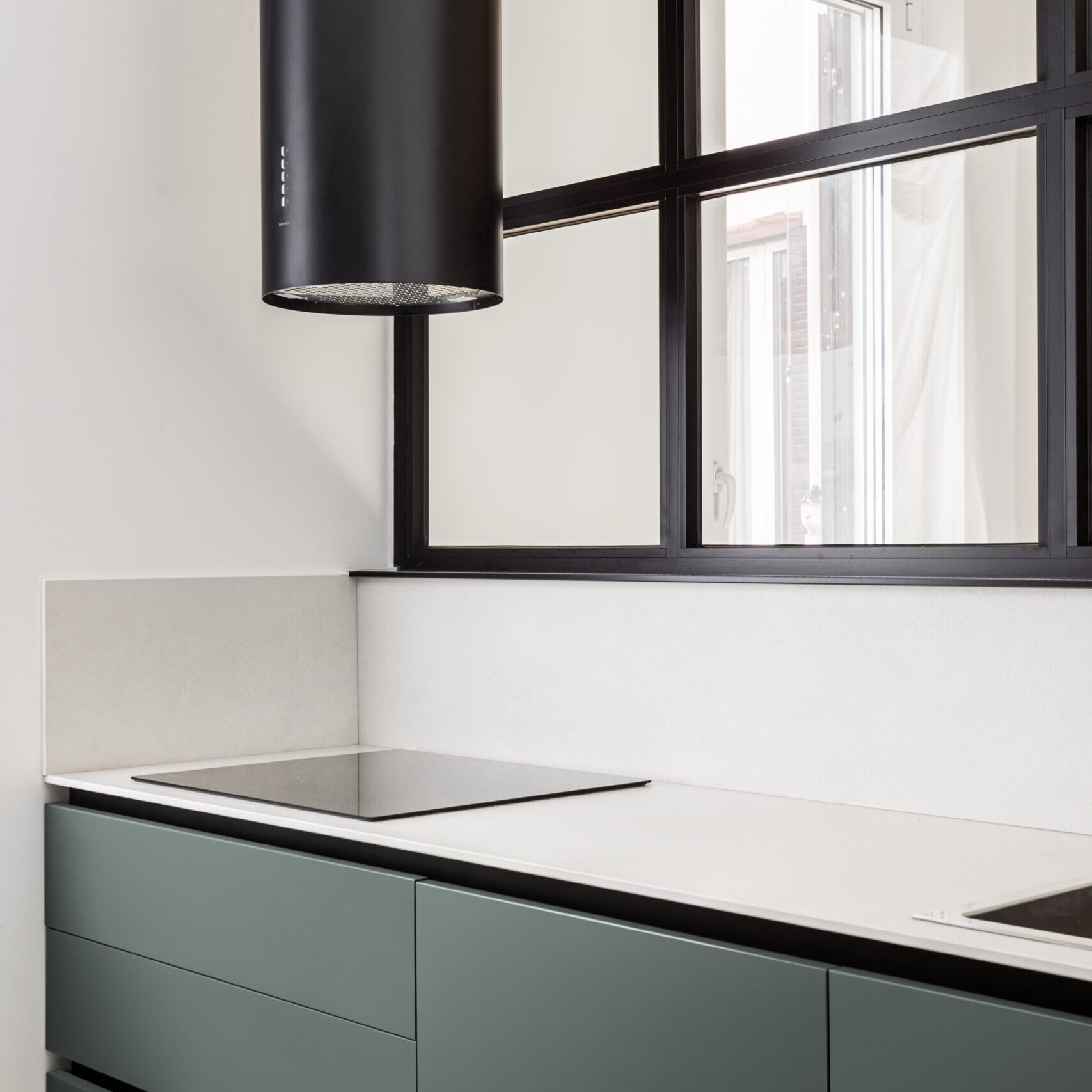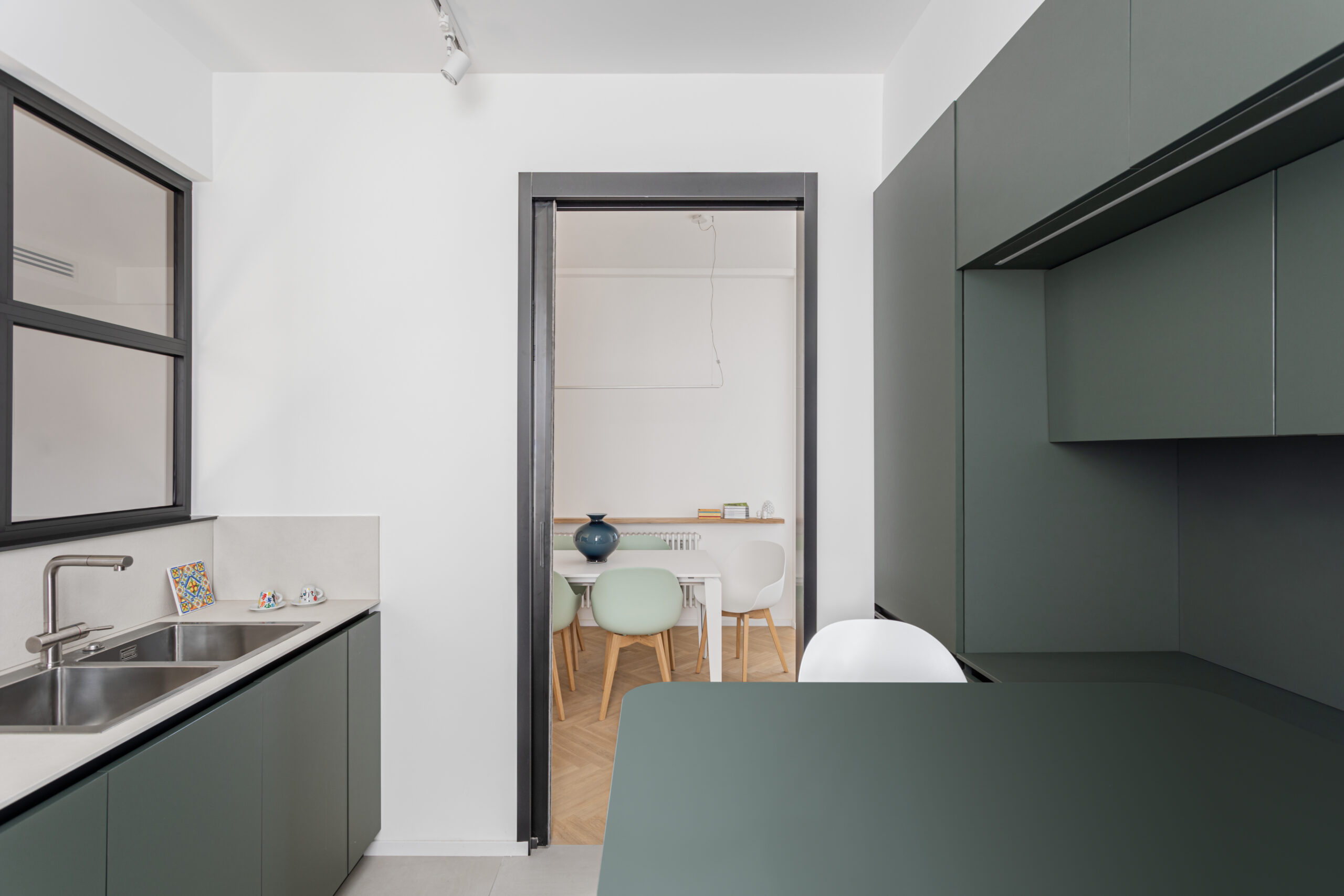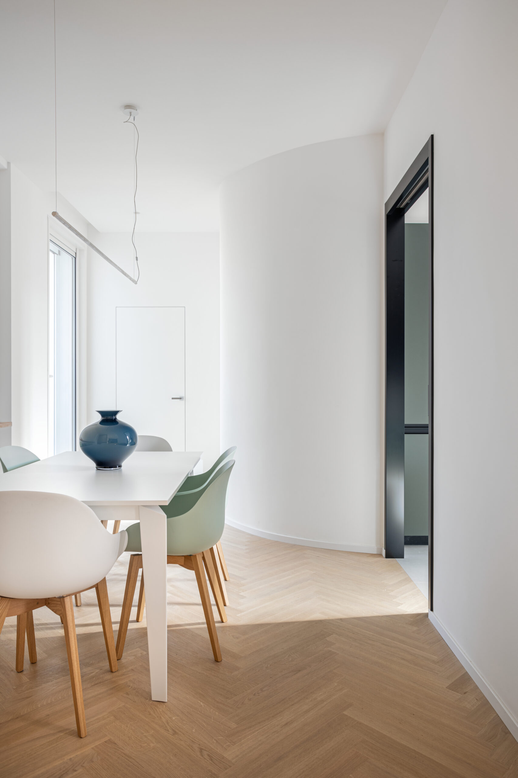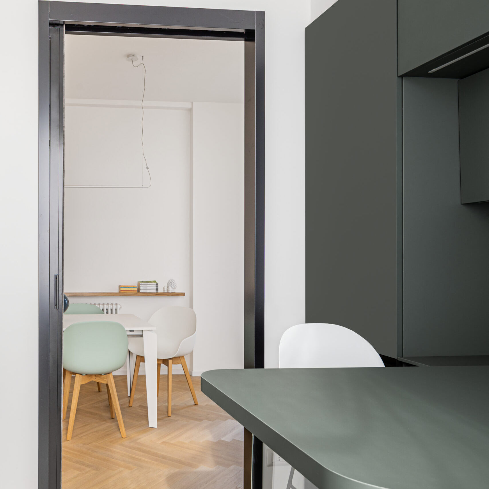 In questo appartamento in Prati a Roma abbiamo realizzato un progetto interamente su misura. L’appartamento si sviluppa in lunghezza e una delle prerogative era rendere parte integrante della zona giorno il terrazzo, elemento molto raro nel quartiere.
