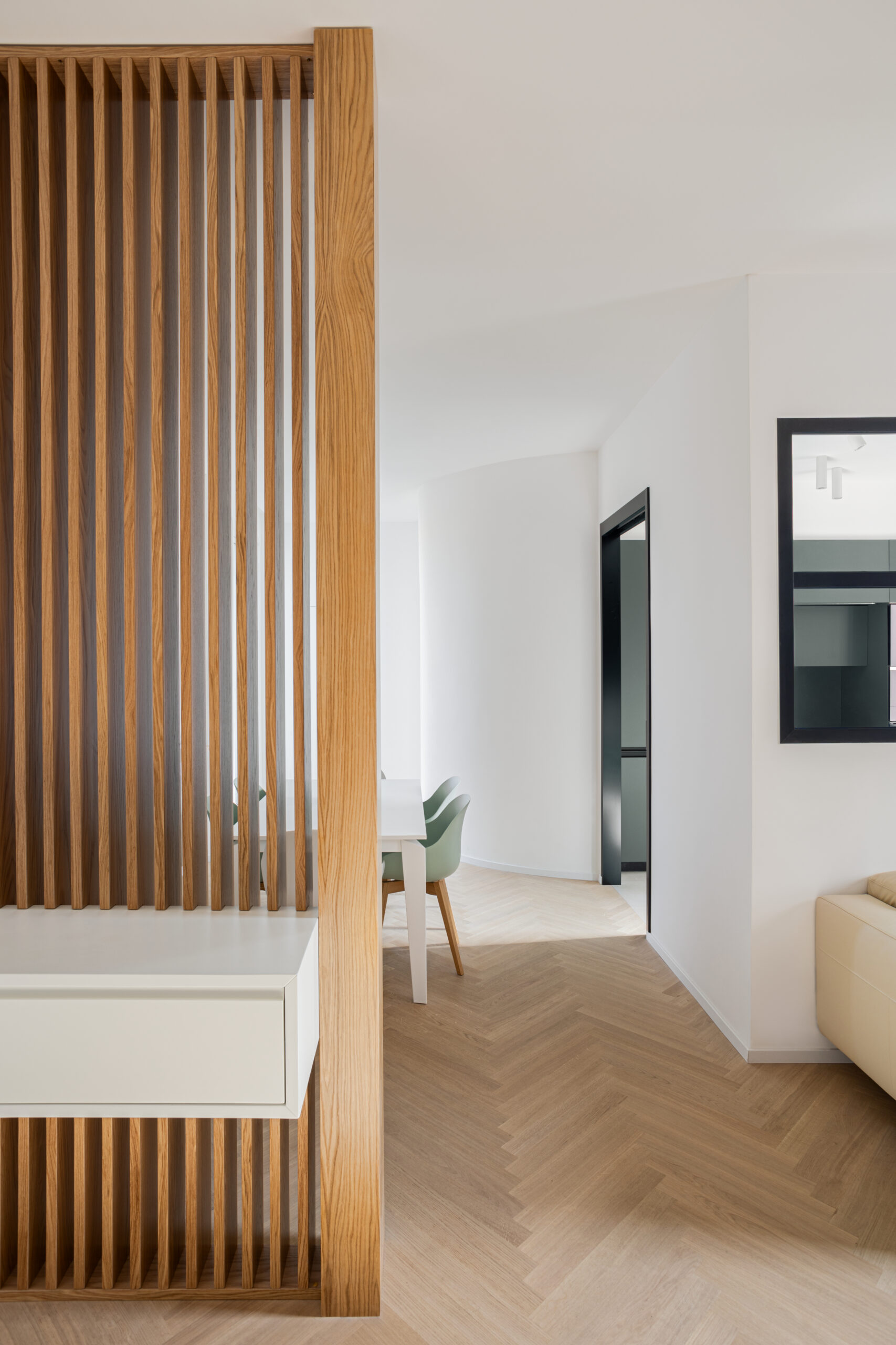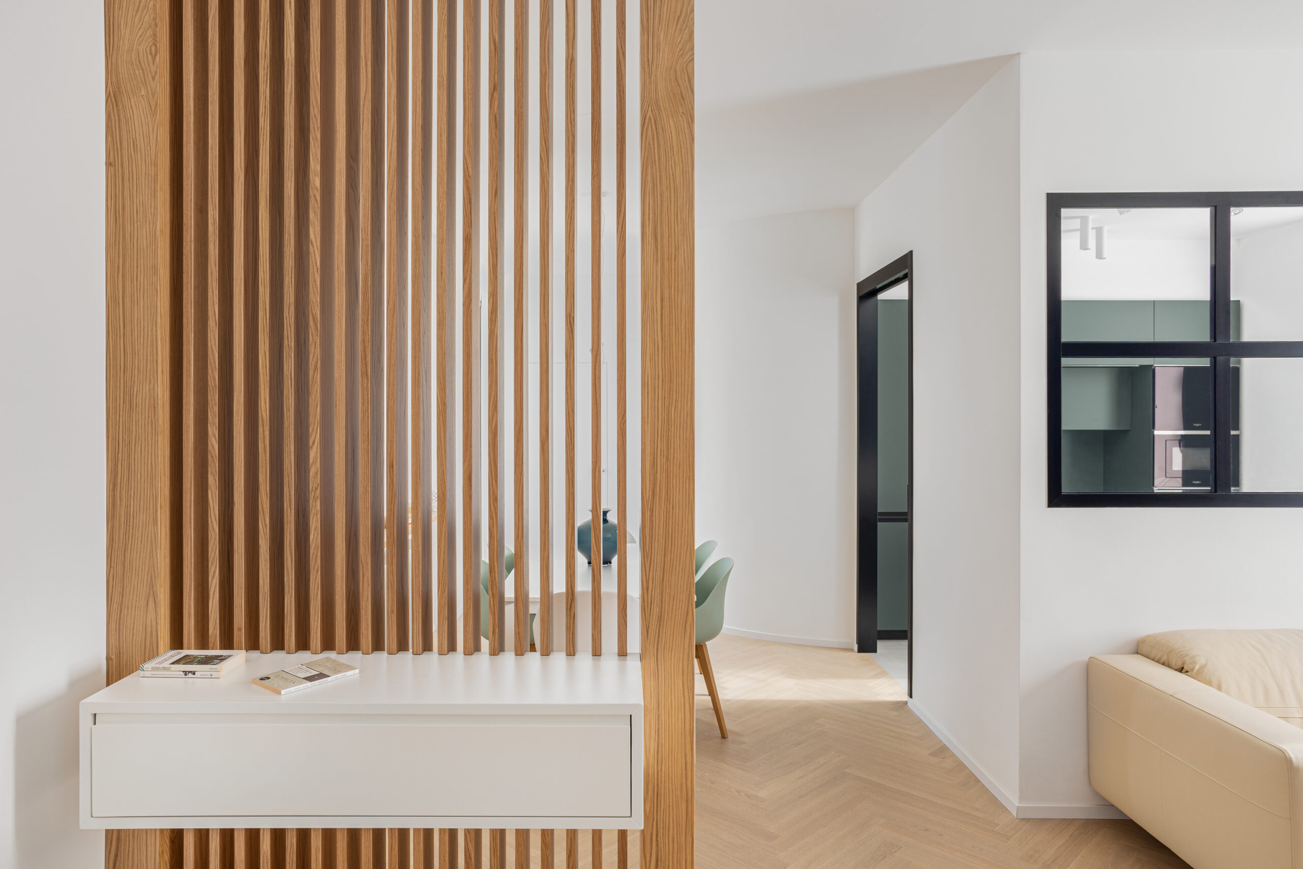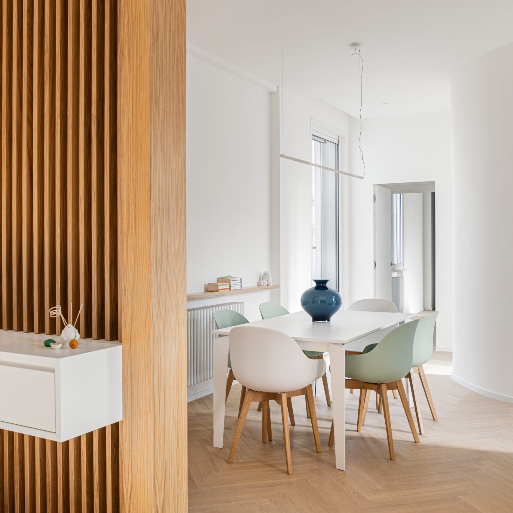 Dato che l’ingresso è a ridosso della zona pranzo, abbiamo pensato di filtrare i due ambienti grazie ad un opera su misura costituita da lamelle e mobile sospeso che ci ha permesso di inglobare e nascondere i tubi del riscaldamento condominiali posizionati in una posizione critica.