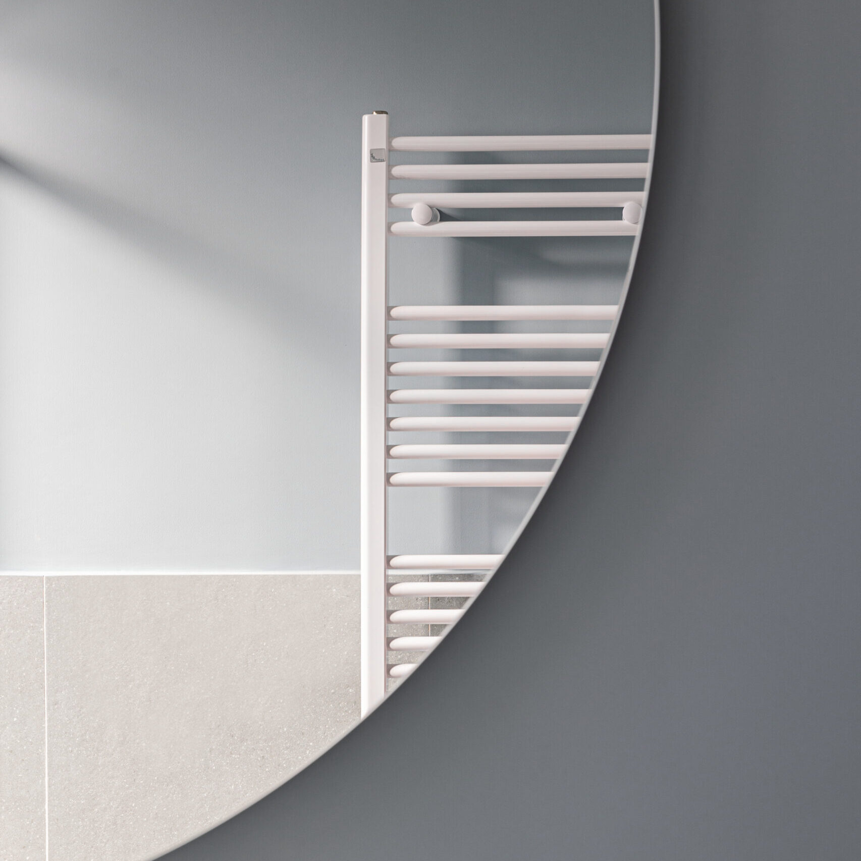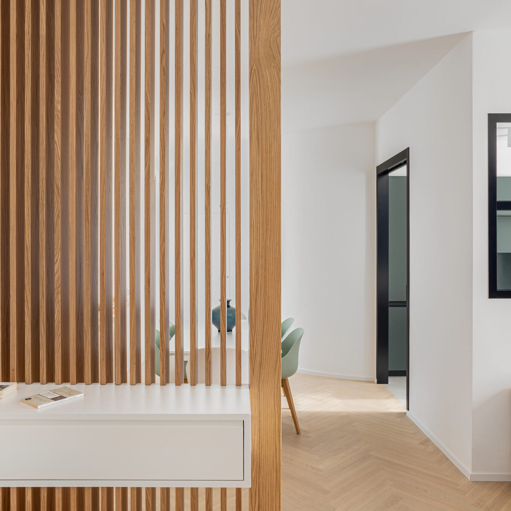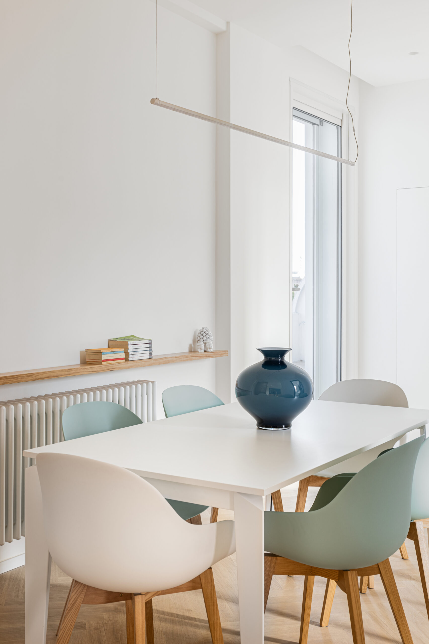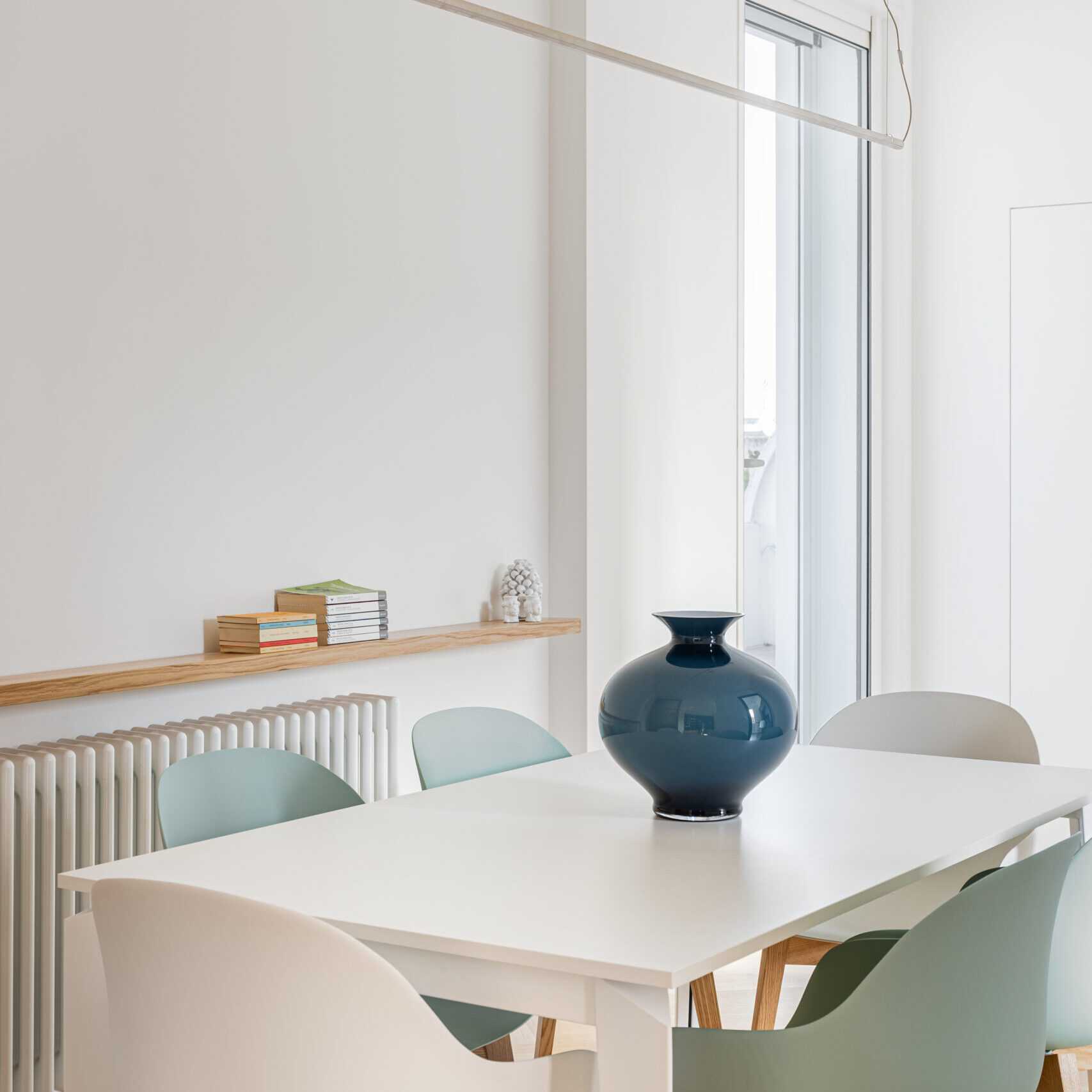 Dato che l’ingresso è a ridosso della zona pranzo, abbiamo pensato di filtrare i due ambienti grazie ad un opera su misura costituita da lamelle e mobile sospeso che ci ha permesso di inglobare e nascondere i tubi del riscaldamento condominiali posizionati in una posizione critica.