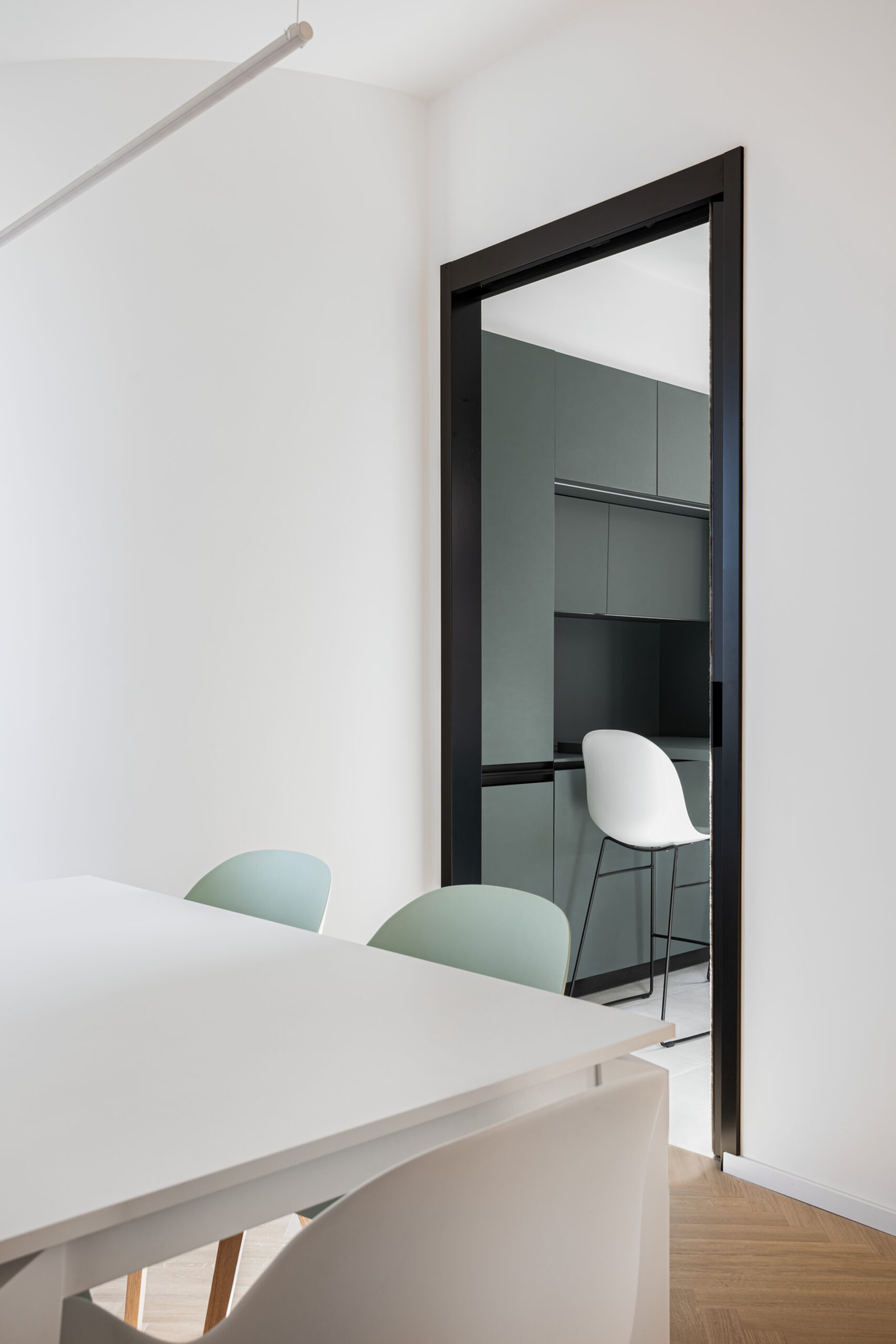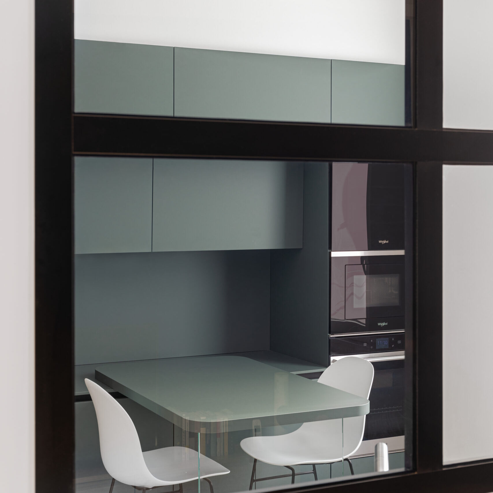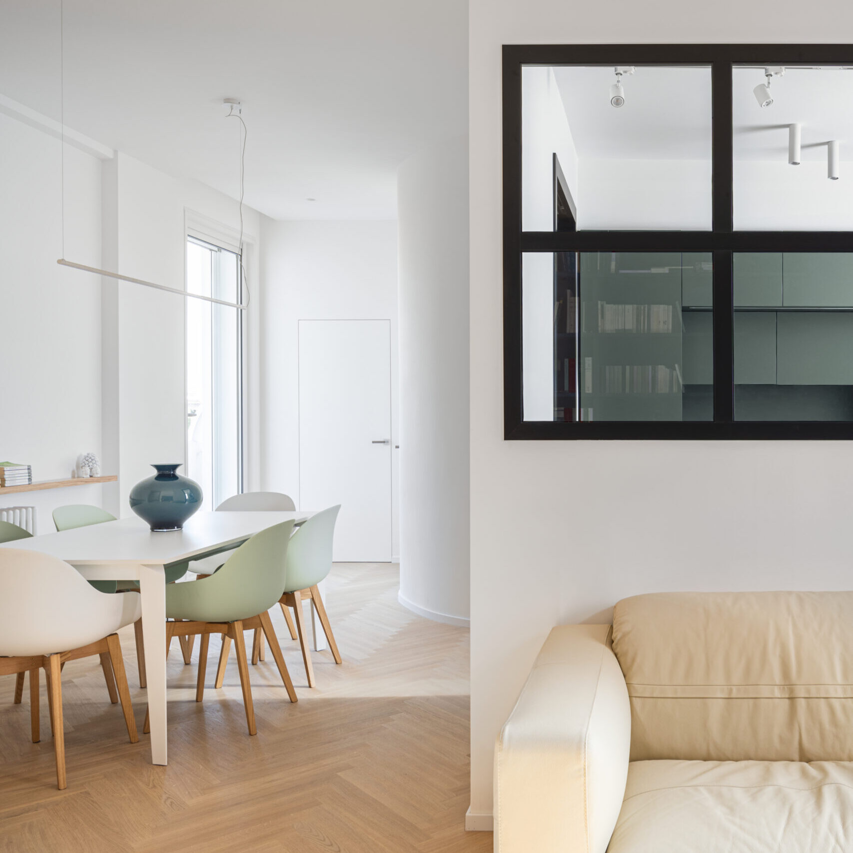 Pareti vetrate, colori decisi e lo studio approfondito dell’accostamento tra le varie finiture completano questo appartamento unico.