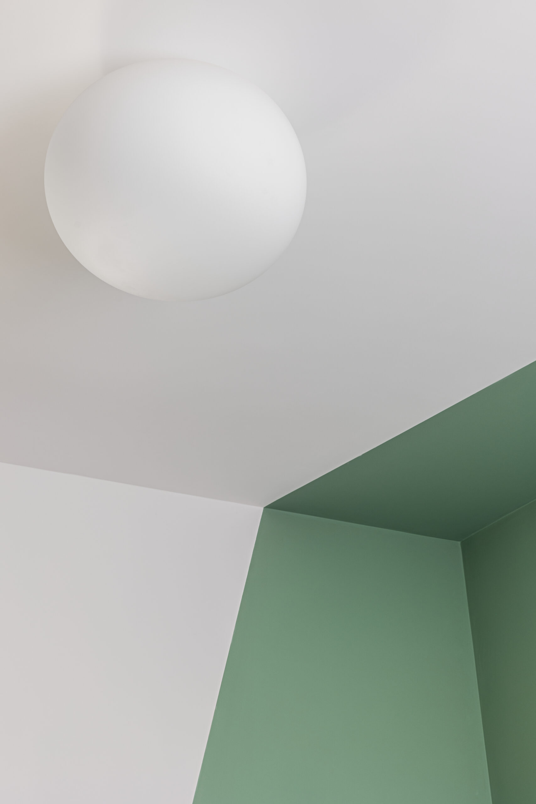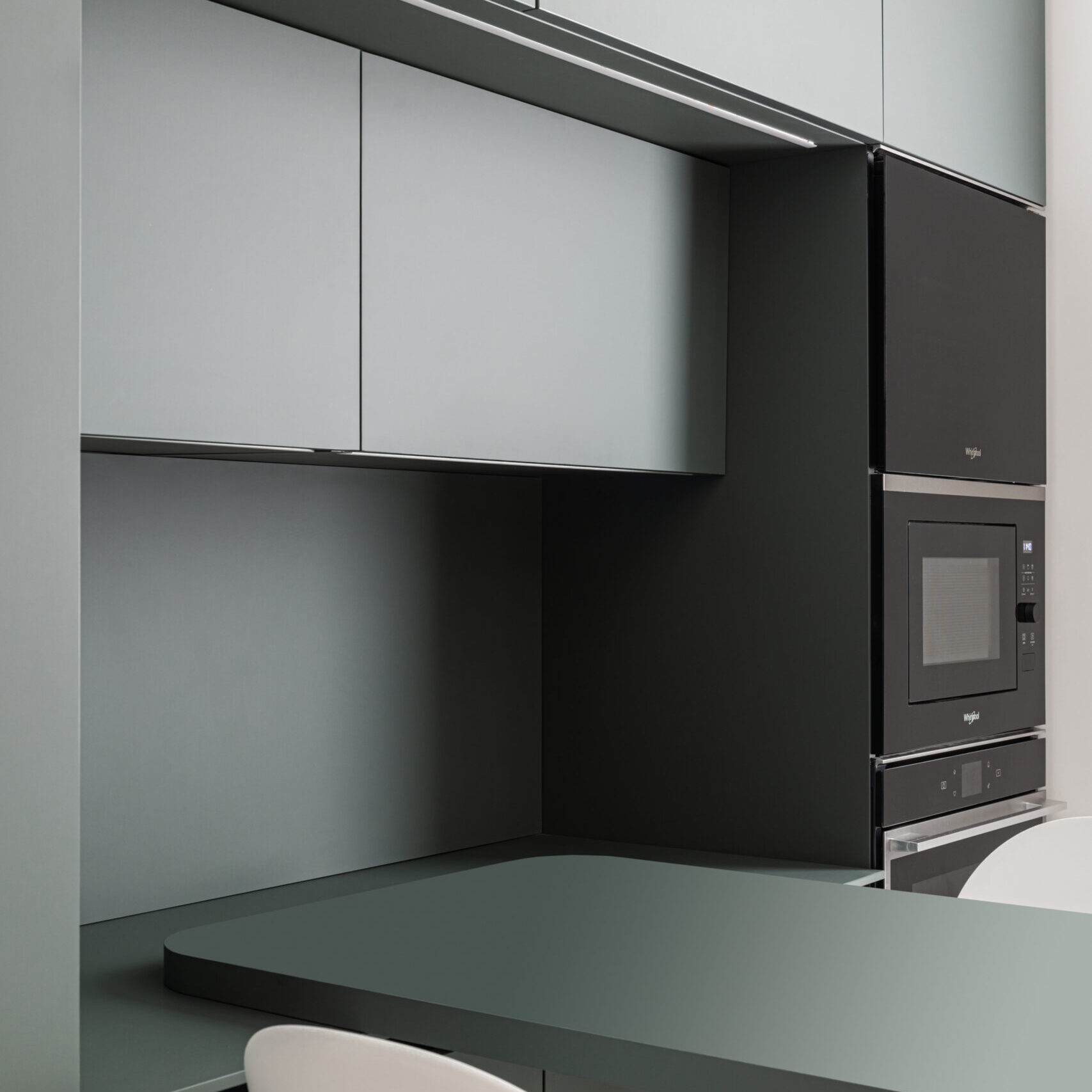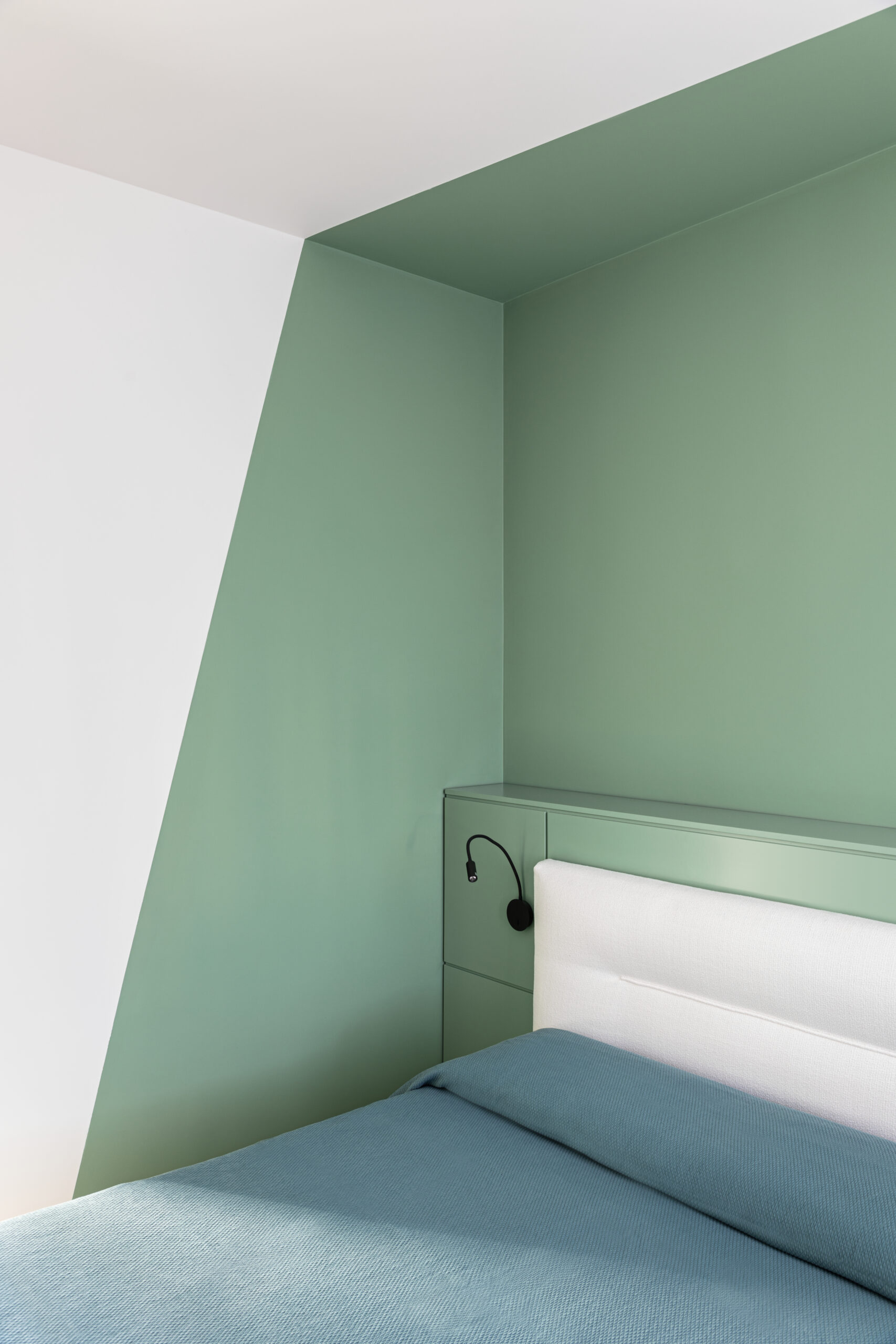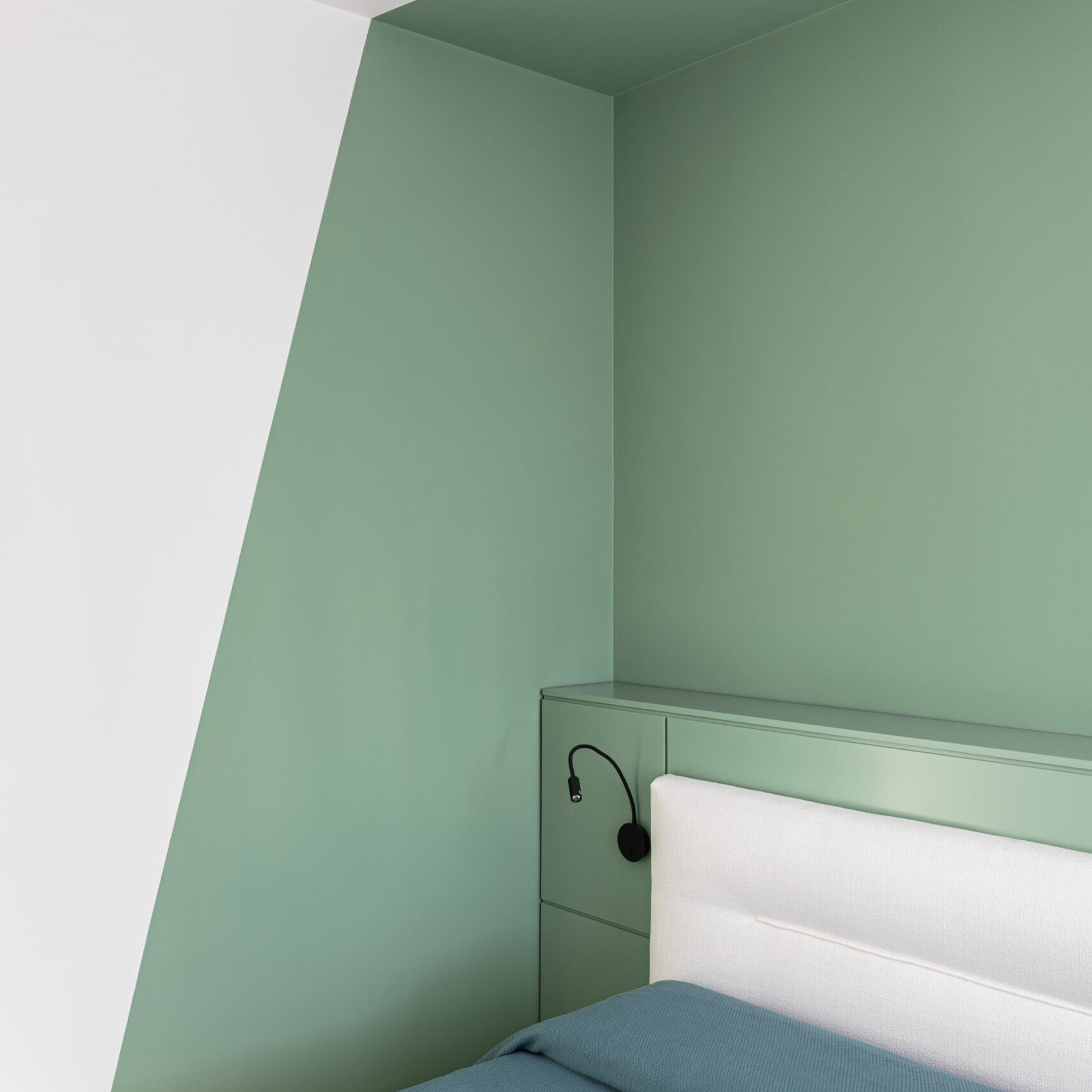 Pareti vetrate, colori decisi e lo studio approfondito dell’accostamento tra le varie finiture completano questo appartamento unico.