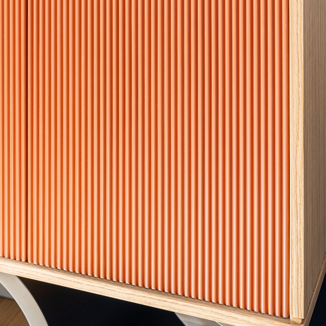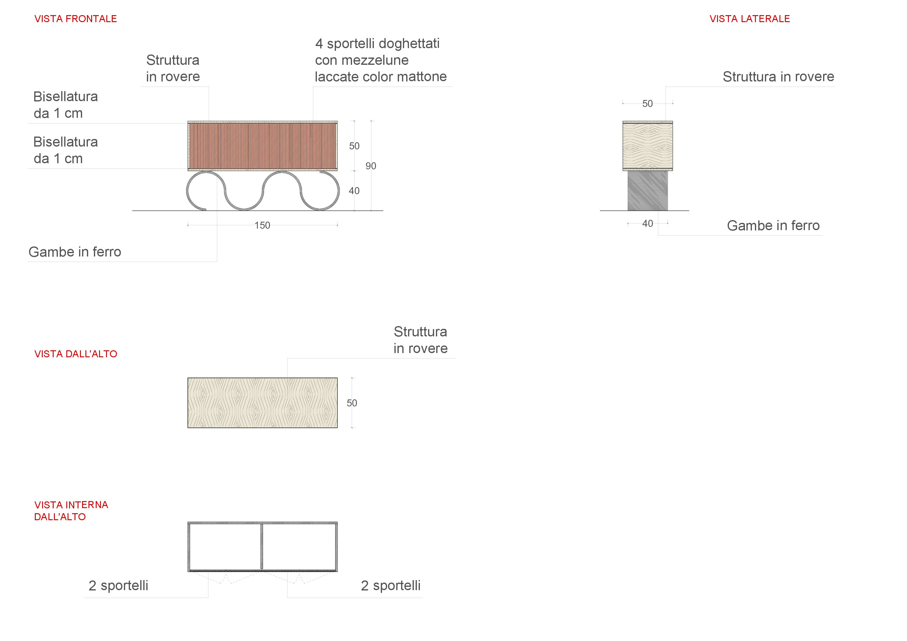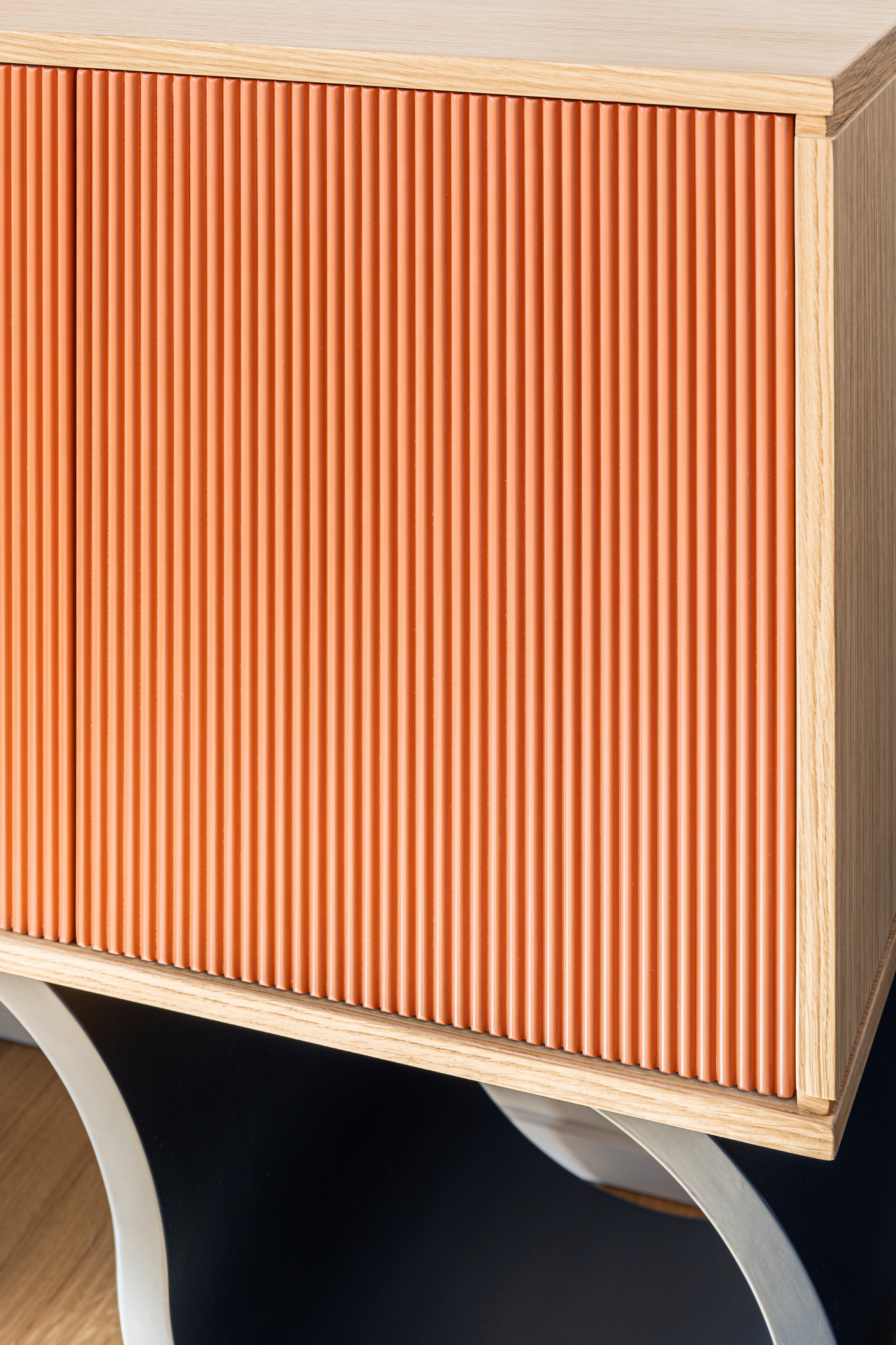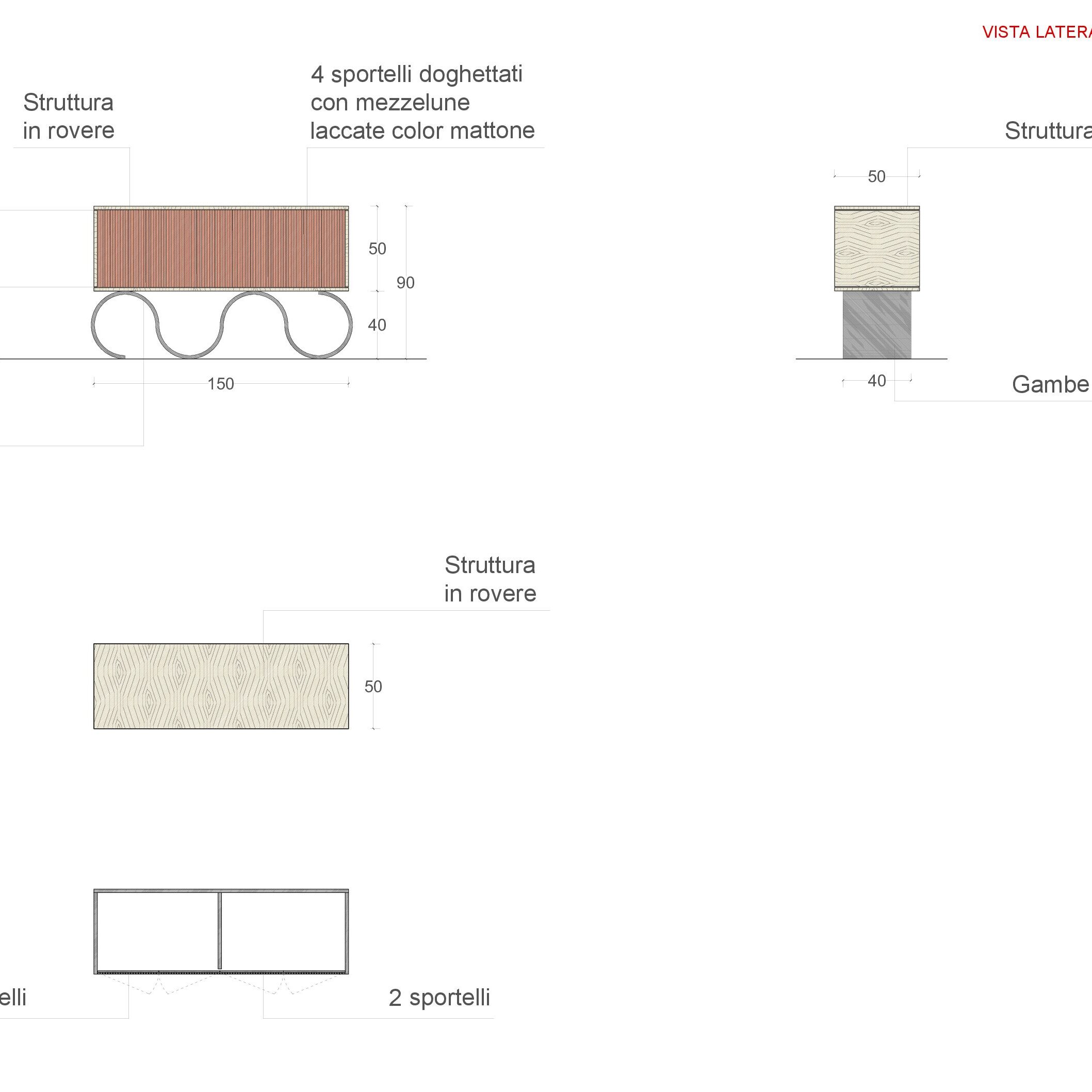 Ogni madia è costituita da 3 livelli, struttura, frontale e gambe, Spider interpreta questi elementi in una forma totalmente nuova, gambe circolari laccate nero opaco, stuttura in rovere con bisellature a separare gli elemnti orizzontali da quelli verticali e sportelli cannettati laccati colore mattone.