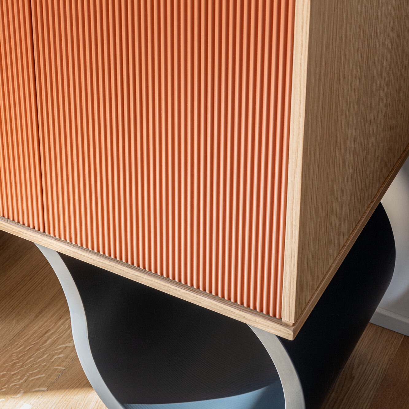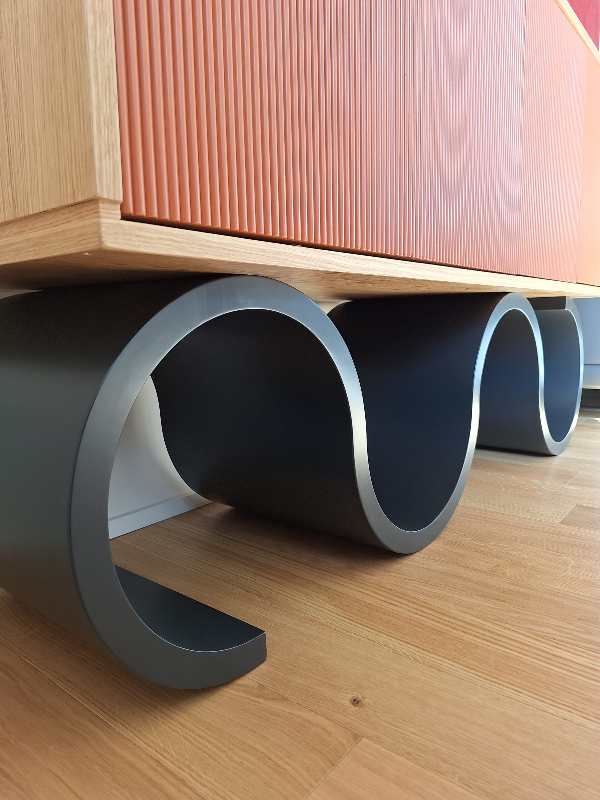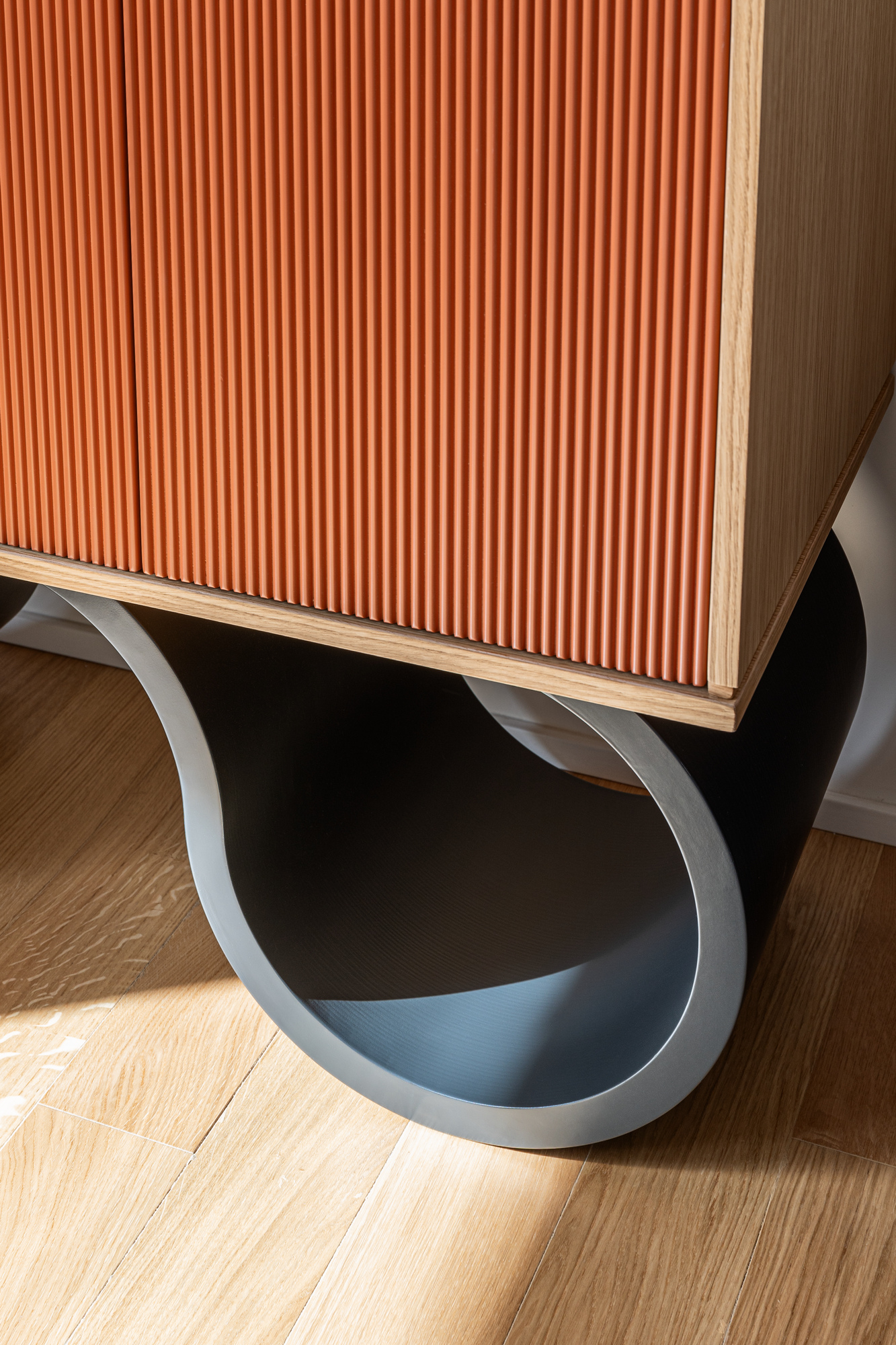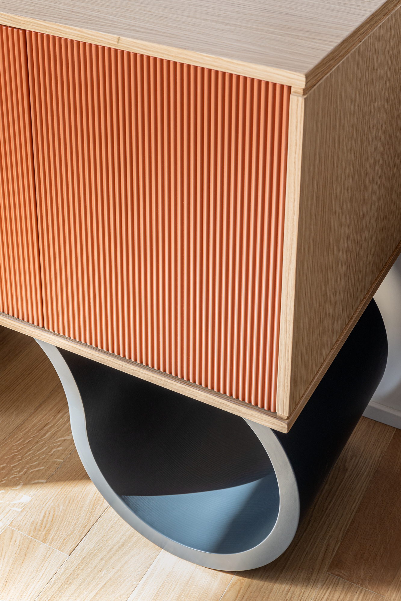 Ogni madia è costituita da 3 livelli, struttura, frontale e gambe, Spider interpreta questi elementi in una forma totalmente nuova, gambe circolari laccate nero opaco, stuttura in rovere con bisellature a separare gli elemnti orizzontali da quelli verticali e sportelli cannettati laccati colore mattone.